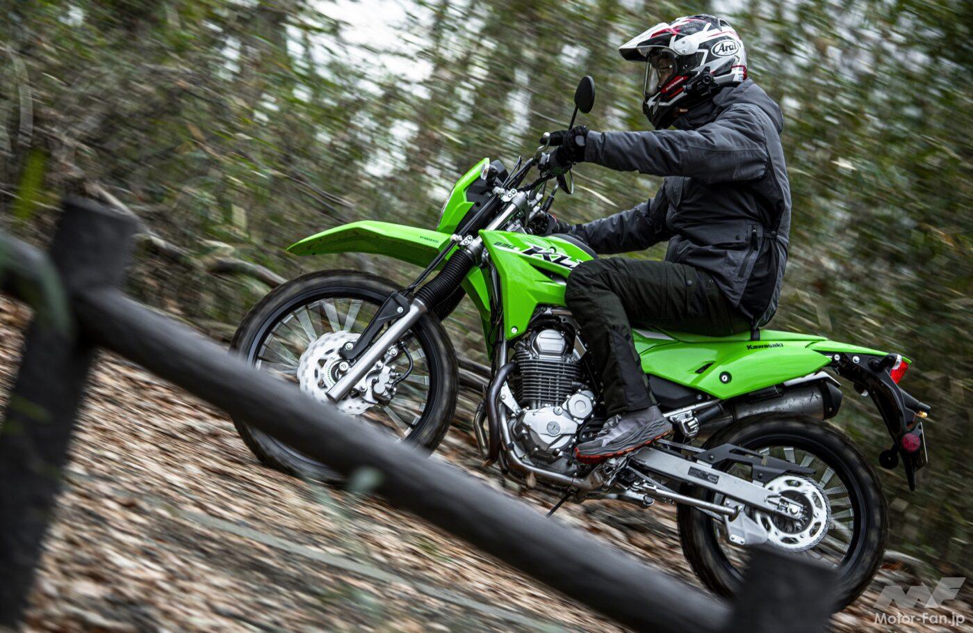 ステーが短いのでミラーが見にくい、ブレーキホースが邪魔でメーターが読みづらい、長距離移動ではお尻が痛くなりやすいなど、個人的に従来型Sで感じていたネガは改善されていない。だが、主にシャシーの改良によってオンとオフの両方向に守備範囲を広げてきたのは大いに評価したいところだ。なお、水冷シングル/24psのCRF250Lとの価格差が2万7500円なので、このクラスのデュアルパーパスを買おうとしていた人にとっては多いに悩むところだが、日本の狭くて急峻な林道ならKLX230 Sの方がより楽しめるだろう。