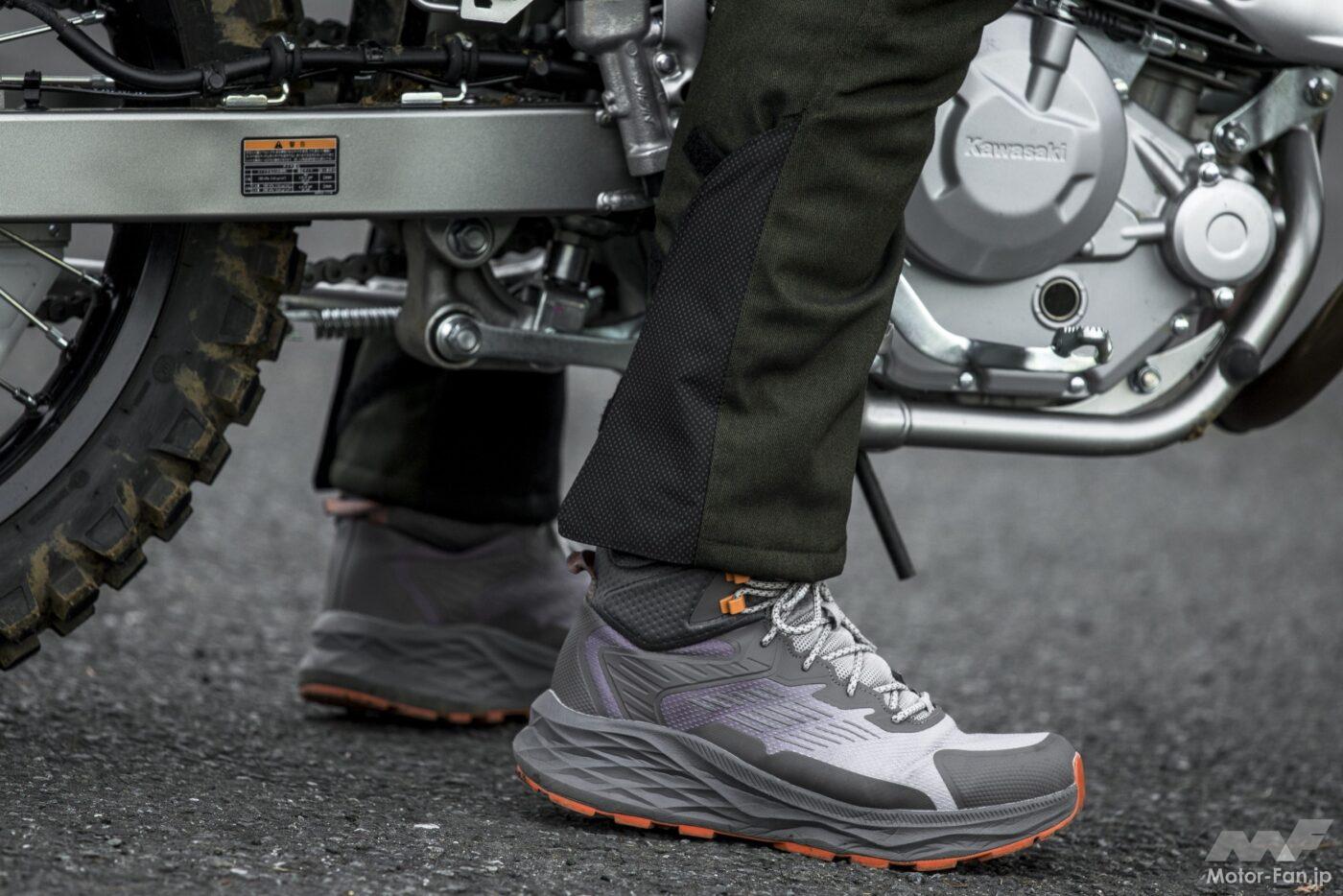 実車を目の前にすると、「これはシートが高い方のKLX230では?」と思うほどに座面が高く見える。だが、いざまたがってみると乗車1Gで前後サスが程よく沈み込み、身長175cmの筆者で両かかとのソールがうっすらと接地する。競合車のホンダ・CRF250Lはシート高が15mm低いが、KLX230 Sの方が車体がスリムな印象があり、トータルでの足着き性は同等レベル。加えて車重はCRFより8kgも軽いので、足に掛かる負担は明らかに少ない。