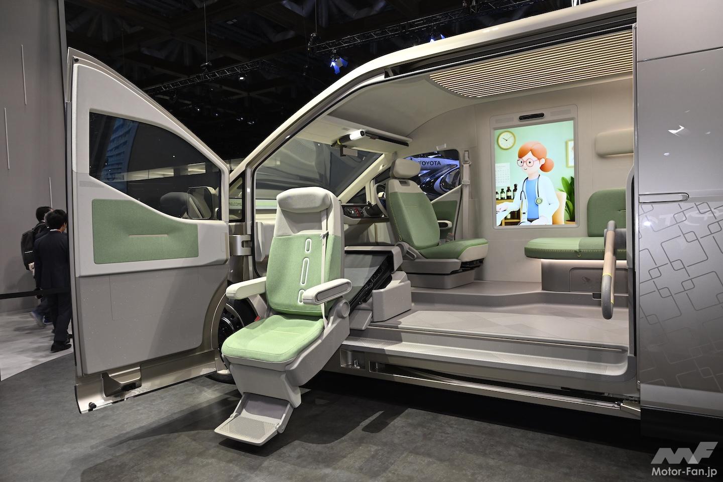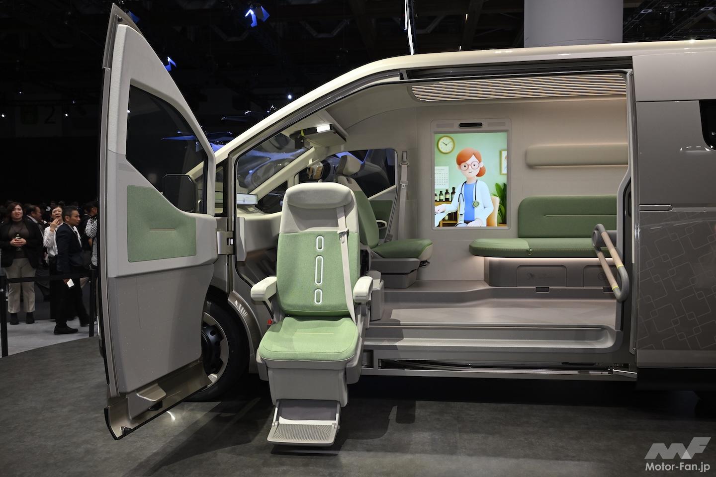 標準モデルが「物流」を主眼に置く一方、ハイルーフ/スーパーロング/ワイドを想定したコンセプトモデルは「人流」、特に医療・福祉分野での活用を想定したもの。メディカルムーバーの進化形として位置づけられ、車椅子用リフト、各種センサーによる体調モニタリング、オンライン通信を利用した医師の遠隔診療機能などを装備。地方や過疎地に住む人々が、どこにいても質の高い医療・福祉サービスを受けられることを目指している。
