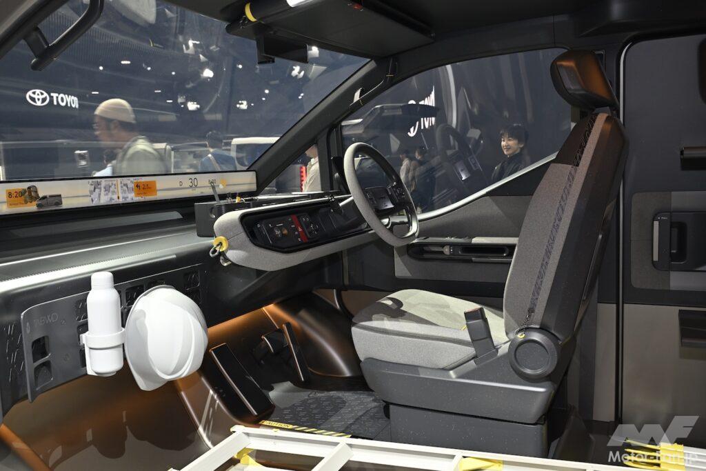 コクピットまわりもコンパクトに設計され、アタッチメントを取り付けたりできる拡張性を確保。横一文字のデジタルディスプレイには、次の現場への到着時刻やタスクリストなど、仕事に必要な情報を表示する機能も想定されている。商用車ユーザーが最も重視する「ダウンタイム(車両の稼働が止まっている状態)」をなくすための配慮だ。