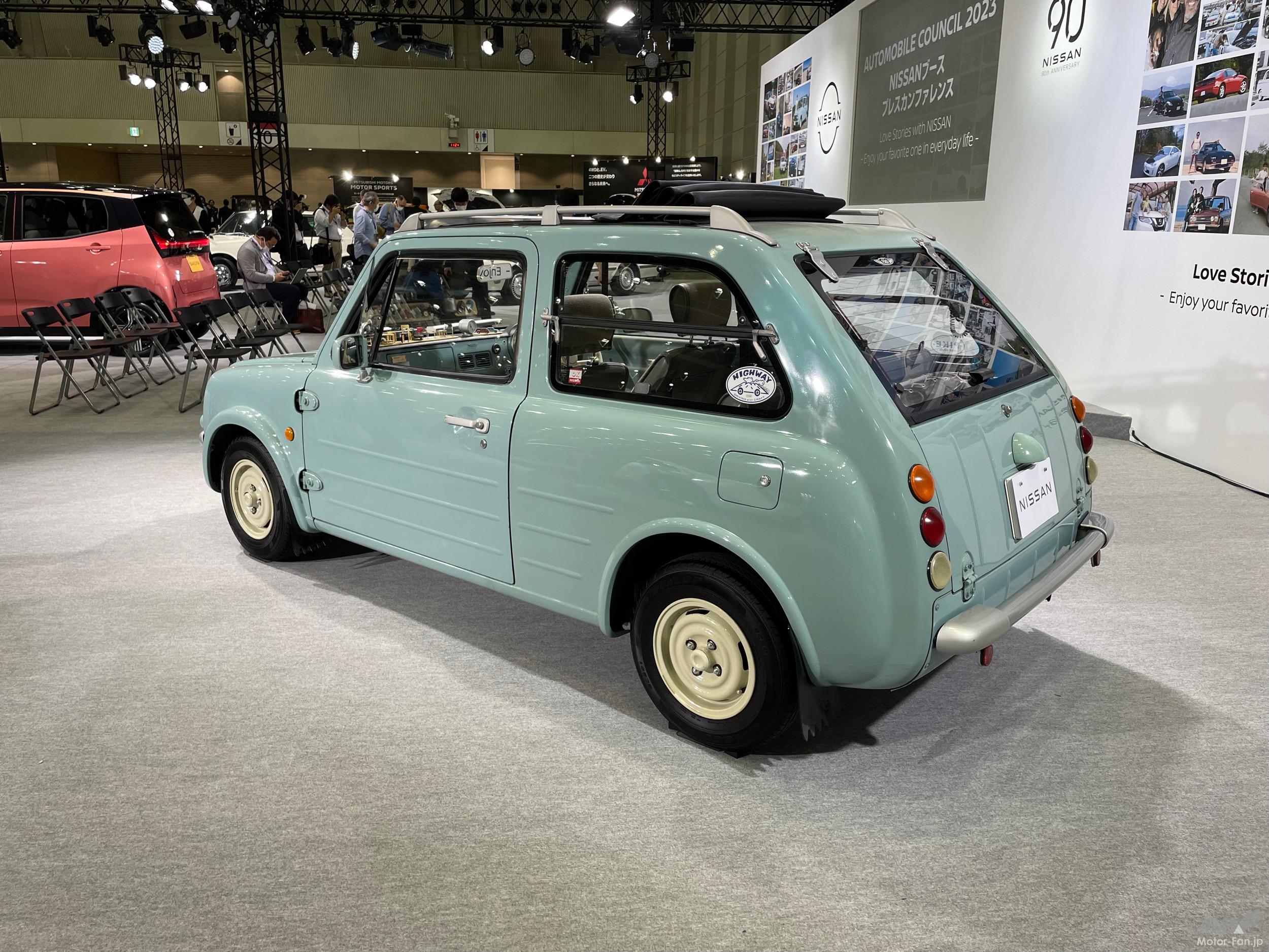 日産ブースに展示されていた「パオ キャンバストップ」は1989年式のPK10型。パオは、Be-1(1987 年発売)に続いて登場した日産の「パイクカー」シリーズの第2弾だ。パイクカーとは少量生産を前提とした遊び心のある「尖った(脱い)」感覚のクルマの総称。パオは1987年の東京モーターショーにコンセプトカーとして出展後、1989年(平成元年)1月に発売されたが、Be-1 とは異なり、3ヶ月間予約を受けた後に全数を生産・納車するという手法が採用された。その結果、総生産台数は3万台に達するほどだった。