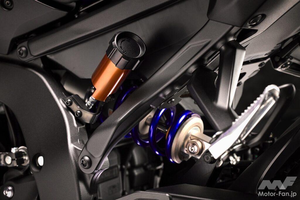 フレームには、ヤマハ歴代スーパースポーツ中で最軽量となる重力鋳造アルミを採用。剛性はねじり18%、縦37%、横16%向上しながらも、メインフレーム単体重量はわずか9.7kgに抑えられた。結果として、高速域での安定性と低速域での柔軟な応答性を両立。公道でもサーキットでも自在に操れるバランスが実現されている。