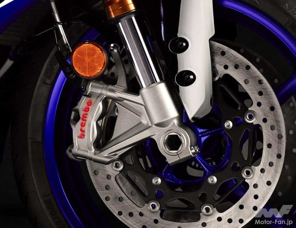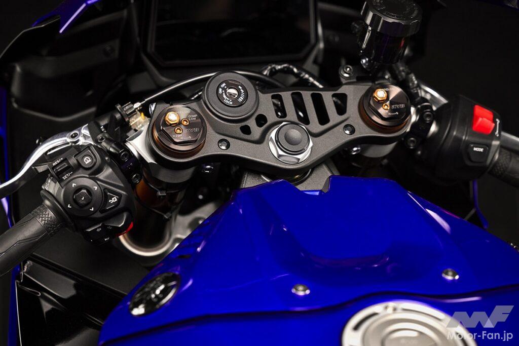 フレームには、ヤマハ歴代スーパースポーツ中で最軽量となる重力鋳造アルミを採用。剛性はねじり18%、縦37%、横16%向上しながらも、メインフレーム単体重量はわずか9.7kgに抑えられた。結果として、高速域での安定性と低速域での柔軟な応答性を両立。公道でもサーキットでも自在に操れるバランスが実現されている。