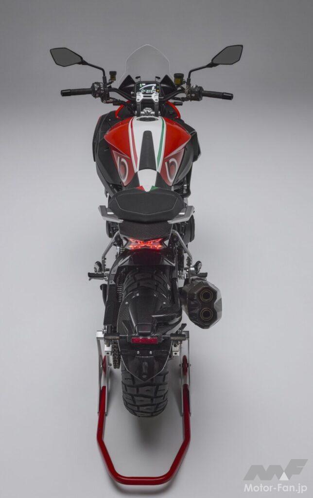 Tesi H2 TERAは、カワサキのスーパーチャージド直列4気筒エンジンを搭載するフラッグシップモデルである。ベースとなるNinja H2譲りのパワートレインは、最高出力200ps超を発生。独自のフロントスイングアーム構造を採用するTesiシリーズ特有のシャシー設計により、剛性とコーナリング性能を両立している。