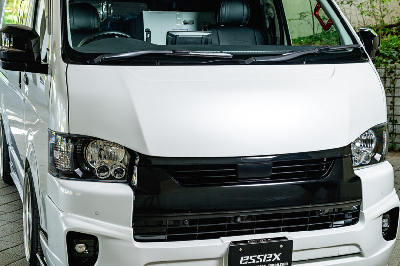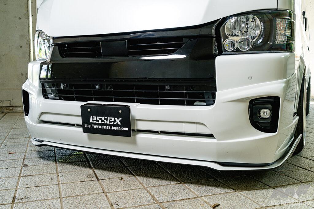 純正バンパーの高い位置から被せて印象を一新させるフロント。バンパー上部のラインがナナメに駆け上がるように描かれるのが独創で躍動。