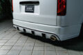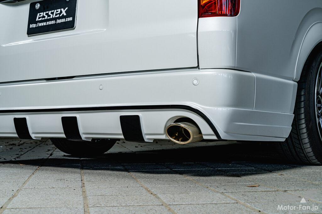 最新のリアはバンパーの半分ほどを覆うハーフスポイラー形状。そのため純正コーナーセンサーはそのままでOKで、バンベースであればステップ付きバンパーにも対応できるなど実用面でのメリットも増した。デザインは立体感を持たせた力強い4連ブロックパターン。デモカーのように塗り分ければその存在感がさらに際立ち、クロスオーバー感が高まるのも魅力的だ。マフラーは左右出し、右出し、レスの3タイプが用意される。