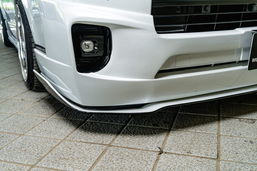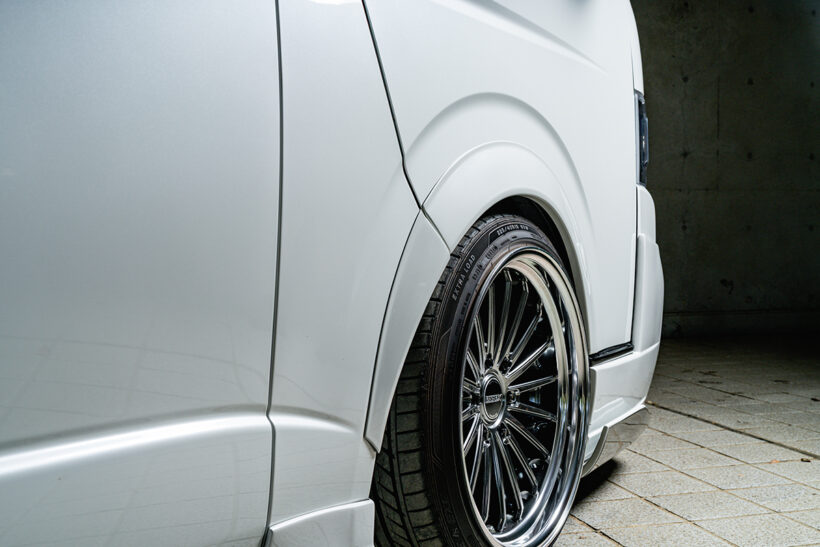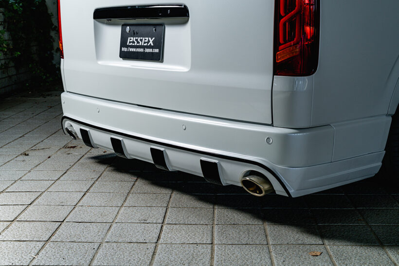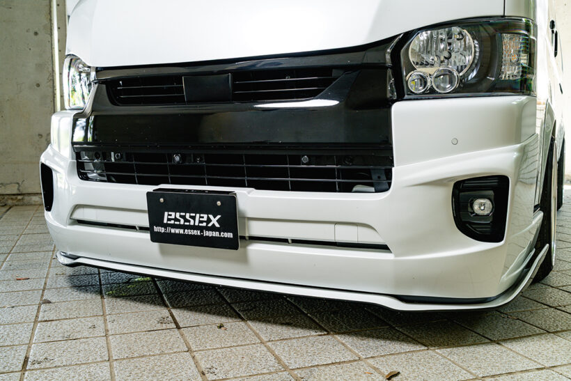 エアロパーツ ボンネットノーズが長い『ハイエース』、新作リアスポイラーの設定でレガーレ・スタイル完成!!【写真・7枚目】 プログレスのバッドパネルは上部にさらりとプレスラインが入ったスタイリッシュな仕立て。純正グリルでも装着可能な点もメリット。 ESSEX・HIACE(for WIDE BODY) SPECIFICATIONS ●レガーレ フロントバンパースポイラー 10万5600円 ●フリッパーVer.Ⅳ 5万6100円 ●プログレスⅠ バッドパネル 8万5800円〜10万3400円 ●レガーレ サイドステップ 7万9200円 ●オーバーフェンダー 5万9400円〜7万9200円 ●レガーレ リアバンパースポイラー 8万4700円 ●プログレスⅡ リアウイング 6万9300円 ●マフラーカッター 1万9800円 ホイール/エセックス・EF(19×9.5J+20) タイヤ/グッドイヤー・イーグルLSエグゼ(225/40R19) 純正バンパーの高い位置から被せて印象を一新させるフロント。バンパー上部のラインがナナメに駆け上がるように描かれるのが独創で躍動。 バンパー下に追加できるフリッパーⅣはカナードの立ち上がり方や幅、厚みなどまで徹底してこだわった造形。レーシームード全開に。 フロント、リアともに片側25㎜ワイドとなるオーバーフェンダー。ABS製で下方へ20㎜ダウンとなる設計だからローダウン効果も大。 後方にダクト風のコの字ラインを配置したサイドステップ。直線と曲線が融合したような造形で、弓なり状となっているのも個性的。 旬なクロスオーバー感も宿した最新デザインのリア。精悍なブロックデザインは塗り分けることでより精悍に。ハーフだから純正機能も生きる。 プログレスⅡのリアウイングは、リアガラスとのすき間をなくした一体感のある造形が特徴。ステップが設けられるため存在感も大。 デモカーはマフラーカッターを使った左右出し。これに加えて右出しシングル、マフラーレスという全3パターンをラインアップする。 最新ホイールのEFは18本スポークが整然と連なるエレガント&スポーティなフィンデザイン。2ピース構造でカラーも全10色と豊富。 この画像の記事を読む