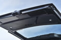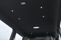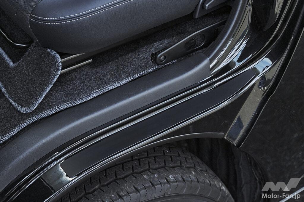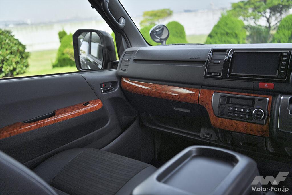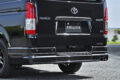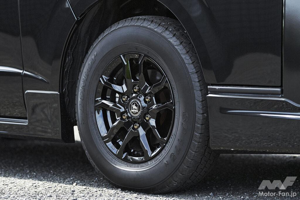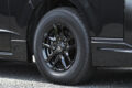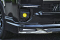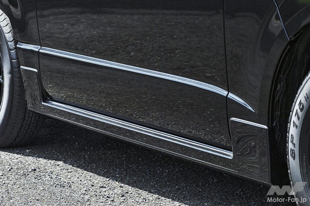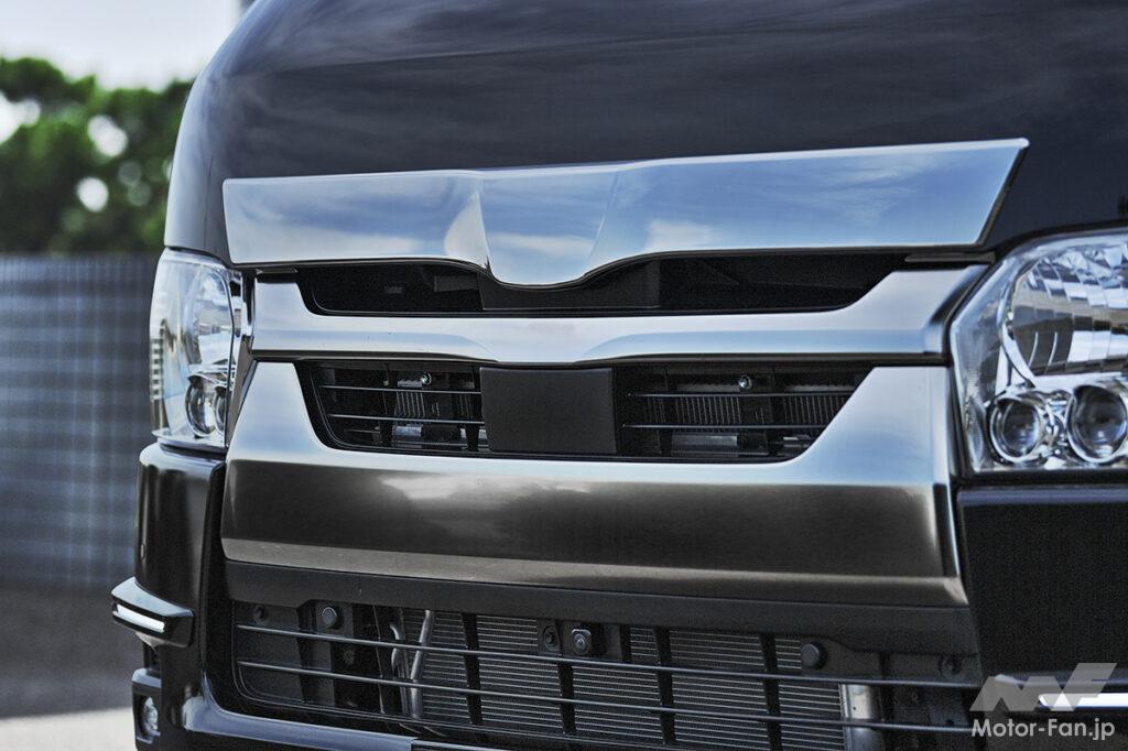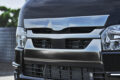 象徴的なのはフロント左右のフォグランプ上部に配置されたシグネチャーイルミ。フォグベゼルと一体感を持たせたブラック基調の立体デザインで、横方向へ鋭く伸びるLEDラインイルミはワイド感と先進性とをダイレクトに演出。立体造形なスモークメッキとLEDデイライトを搭載したフロントスポイラーとの連動感も高く、その両者ともがあえてスクエア基調となっているのもボックスフォルムなハイエースのダイナミックさをしっかりと引き上げてくれる。