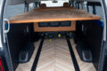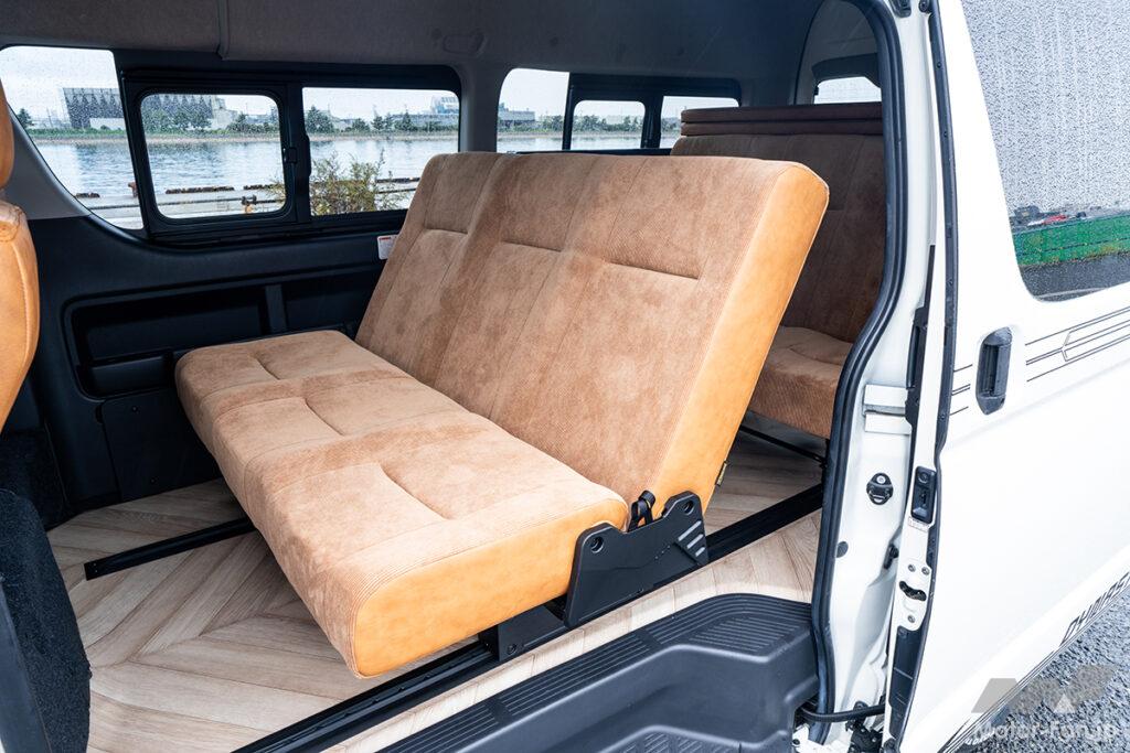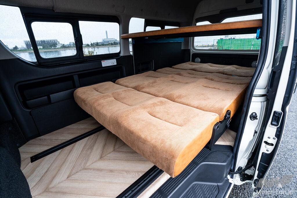 このハイエースの外観はダイナスティのアイテムを使ってデコレイトされておりベースが福祉車両という面影はない。そしてIFUUが得意とする2脚のREVOシートはフロントのバケットシートカバーとシンクロさせたスタイリッシュなヴィンテージキャメルのコーデュロイ仕様。広々とした就寝スペースを確保したフルフラットのベッドから対面ラウンジシートまで多彩なシートアレンジを可能にしている。さらにハイルーフのメリットを最大限に活用した2段ベッド仕様も注目のカスタムポイントだ。