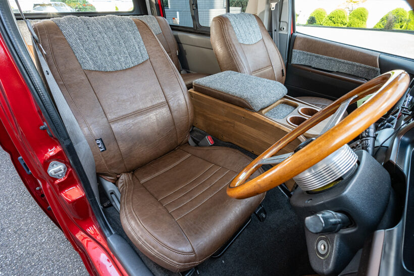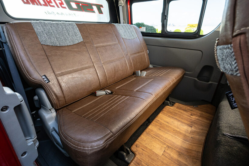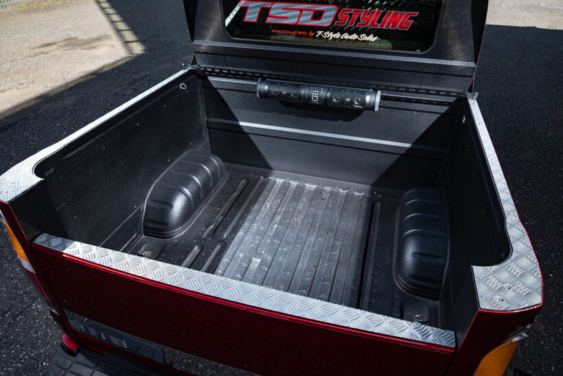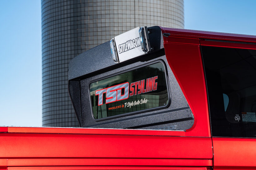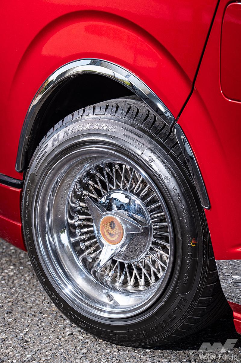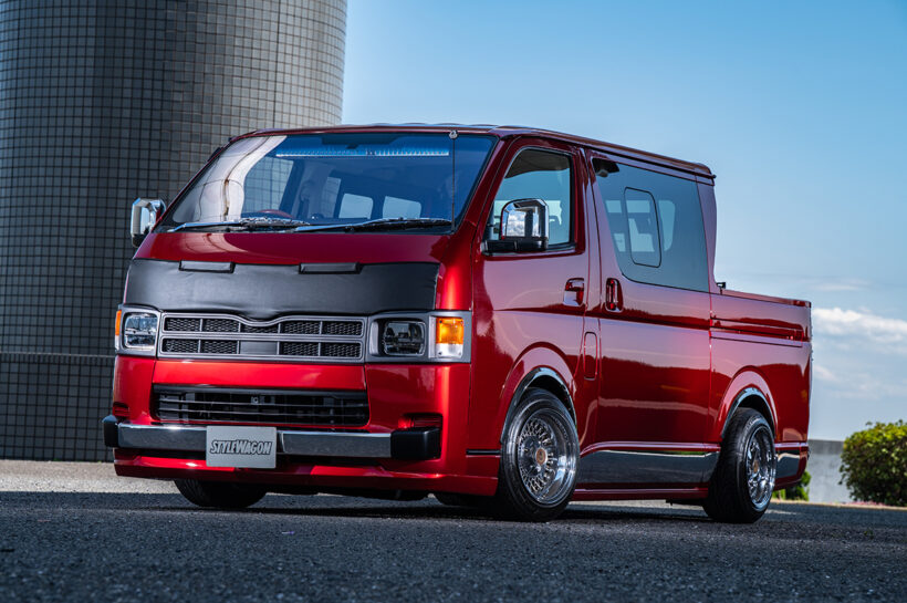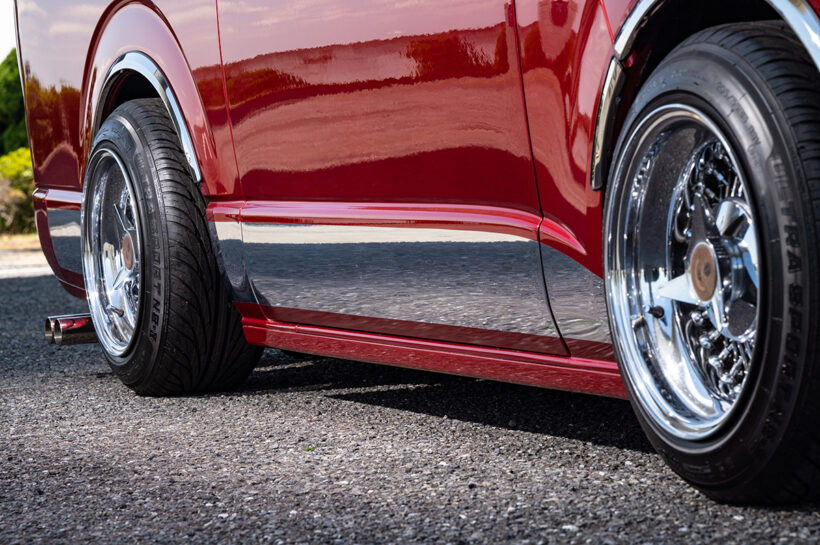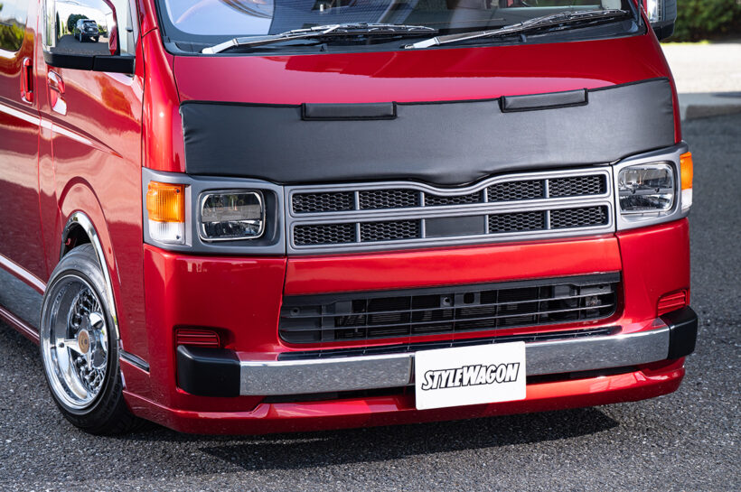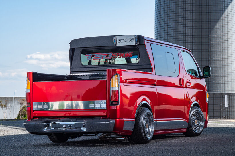 カスタム 荷台部架装費用は!? 90年代のUSローライダー! ハイエースをピックアップ化した、その名も『ハイトラッキン』爆誕!!【写真・11枚目】 T.S.D STYLING・HIACE レトロなアメリカンピックアップフェイスへと進化する、シャイアンフェイスキットもベストマッチ。フェンダートリムやメッキワイパーなど、当時のトレンドアイテムも投入。SPECIFICATIONS ●シャイアンフェイスキット 25万800円 ●シャイアンバンパー 8万5800円 ※上記2点セット 31万9000円 ●荷台部架装費用 253万円 ●アンティークレザー×ツイードシートカバー 12万1000円 ●センターコンソール 14万8500円 ●ウッドフロアマット 2万5300円 ホイール/マクリーン(15×10.0J±0) タイヤ/ナンカン・NS-Ⅱ(205/55R15) ハイトラッキンの標準仕様はあおりが横開きとなるが、こちらはオプションの縦開き。バイクなどのトランポとして使うのも面白いだろう。 荷台は高さ700mmで、他のピックアップトラックと遜色ない作り。ラプター塗装を施して耐久性を高めている。前方にはスピーカーを装備。 アメリカンピックアップらしさを強調するステップバンパーは、USトヨタのタコマ純正品を加工して装着。あおりのメッキパネルも効果的。 リアウインドウの作り込みも違和感なし。ピンストライプで同社のロゴを入れてローライダーらしさを底上げ。 シャイアンフェイスキットの良さを高めるシャイアンバンパーをプラス。色分けしやすい3ピース構造。 ワイヤーホイールは90年代に爆発的ヒットを記録したマクリーン。スピンナーも付いてビジュアルは完璧。 クロームメッキのロッカーパネルも、ローライダー全盛期に一世を風靡したアイテム。今見ると逆に新鮮だ。 マフラーは自社製品をベースに、ワンオフで右サイド出し加工。デュアルのテールエンドがインパクト満点。 この画像の記事を読む