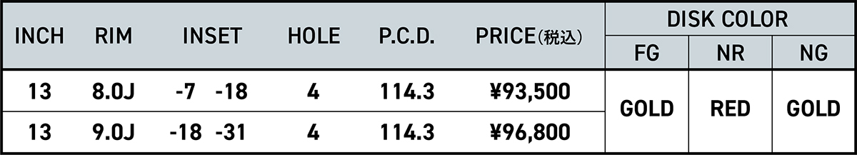 今回発売されたのはFG、NR、NGの3種類。オリジナルのレーシングフォージは、ディスク・リムともに鍛造だったが、復刻版は削り出し鍛造ディスクと圧延リム(スピニングリム)の組み合わせとなる。しかしながら、素材や加工精度の進化によって、強度&剛性等、スポーツホイールに求められるスペックが飛躍していることは言うまでもない。