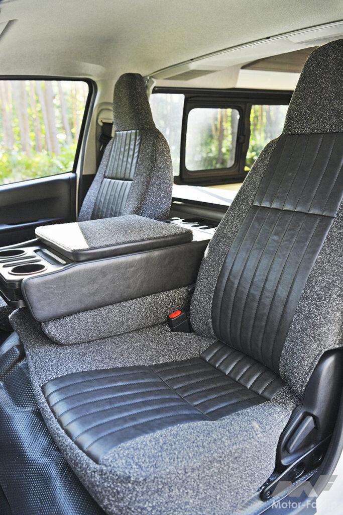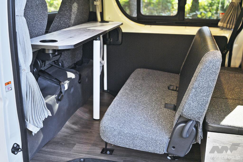 荷室の右側にシェルフを、そして左側にベンチシートを備え、ベッドマットを敷くことでフルフラットな広々空間になるウッドリム。ハイエース最小となるナローボディでも十分な広さで、大人2人で車中泊やオートキャンプに出掛けるにはぴったりのパッケージになっている。しかも、オプションを追加すれば、よりお部屋感がアップ。友達やパートナーとゆっくりとした時間を過ごすのにおすすめの空間であるのは間違いない。
