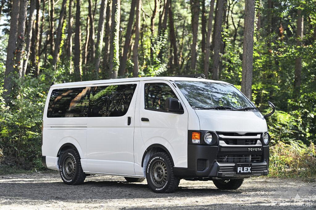 各地にハイエース専門店を展開するフレックスでは、キャンピングカーシリーズのモビーディックとは別に、いろいろな内装カスタムモデルをラインアップ。今回ピックアップするのは、ナローボディのバンDXをベースにした「WoodRim(ウッドリム)」だ。