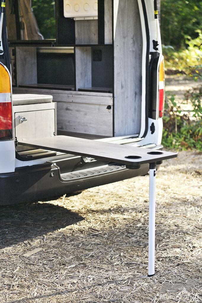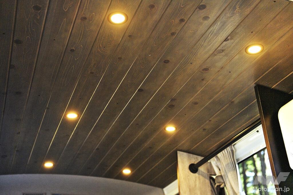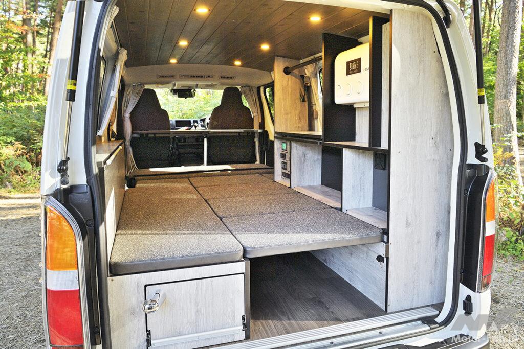 荷室の右側にシェルフを、そして左側にベンチシートを備え、ベッドマットを敷くことでフルフラットな広々空間になるウッドリム。ハイエース最小となるナローボディでも十分な広さで、大人2人で車中泊やオートキャンプに出掛けるにはぴったりのパッケージになっている。しかも、オプションを追加すれば、よりお部屋感がアップ。友達やパートナーとゆっくりとした時間を過ごすのにおすすめの空間であるのは間違いない。