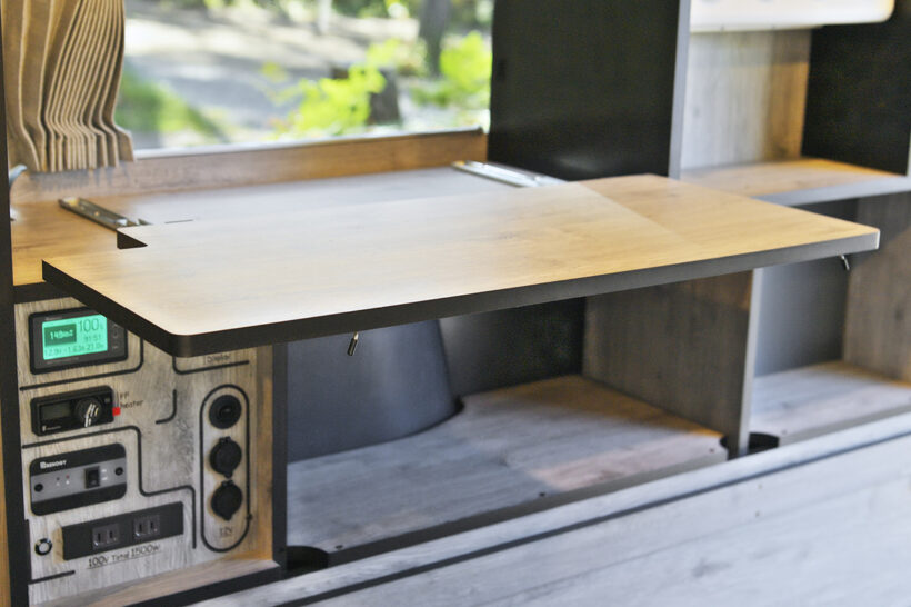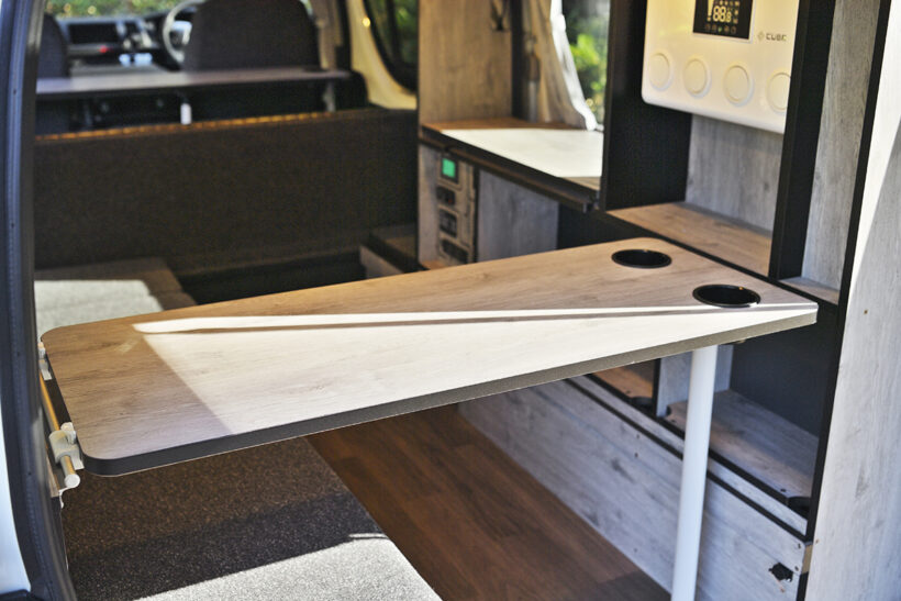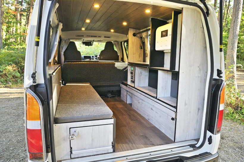 カスタム 【車両価格:340万円〜】FLEX「ウッドリム」の『ハイエース』で、週末旅を思い切り満喫!!【写真・10枚目】 FLEX・WoodRim 丸目ヘッドライトのRe:Classicで架装したナローボディ。サイドオーニングやリアラダーでアウトドア感を高めたスタイリング。 ベッドモード ドライブ&リビングモード シェルフにはコンセントやシガソケ電源、スイッチをおしゃれにレイアウトしたコントロールパネルを設置。 脱着可能なテーブルはフレキシブルな設計。車内で使う際はウインドウ下、車外で使う際は左側のボックスにあるレールに取り付ける。 標準仕様は天井両サイドに間接照明を搭載するが、オプションで写真のように木の温かみを感じるウッドセイルにすることもできる。 クーラーやFFヒーターもオプションで装着できる。夏の暑さや冬の寒さをしのぐのにおすすめ。サブバッテリーも用意している。 この画像の記事を読む