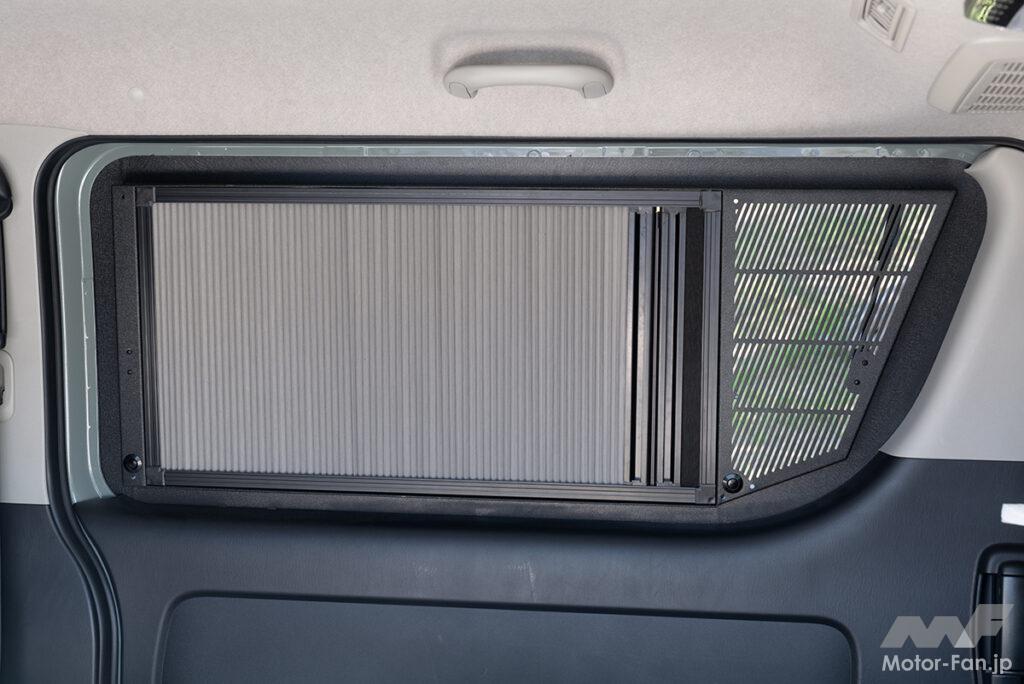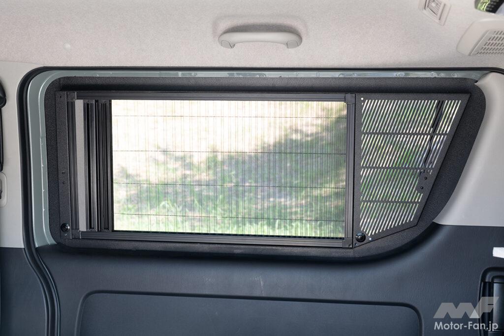 網戸とシェード、全開放と開閉のバリエーションも豊富なため、シーンや気分に合わせた使用が可能な点もメリット。純正プライバシーガラス近似色で、閉めている状態なら後付け感もほぼゼロ。純正ウインドウ時と見た目が変わらないのも特徴だ。