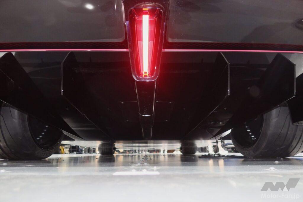 床下はフラット。リヤバンパーは下側を意図的に後方まで延ばしているという。これにより車両後方で発生する(ドラッグの原因になる)渦の発生を防ぐ。リヤウイングが左右でつながっておらず切れているのは、ダウンフォースとドラッグのバランスを考えてのこと(ドラッグを減らしたい)。翼端板はヨー方向の安定性に寄与する役割を担う。