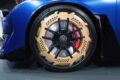 では、空力面で目につくポイントを見ていこう。ボンネットフードのダクトは熱交換器の熱気抜きというより、純粋に空力的な効果を狙ったものだそう。フード内の空気を抜いてスムーズにルーフに流す意図。フロントバンパー両端には開口部があり、空気がフロントタイヤの側面に抜ける仕組み。いわゆるエアカーテンで、フロントタイヤ起因の乱流を整えてドラッグ(空気抵抗)を減らす狙い。ゴールドに輝くホイールカバーも空力的な効果を狙ったものだ。
