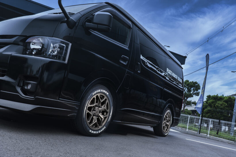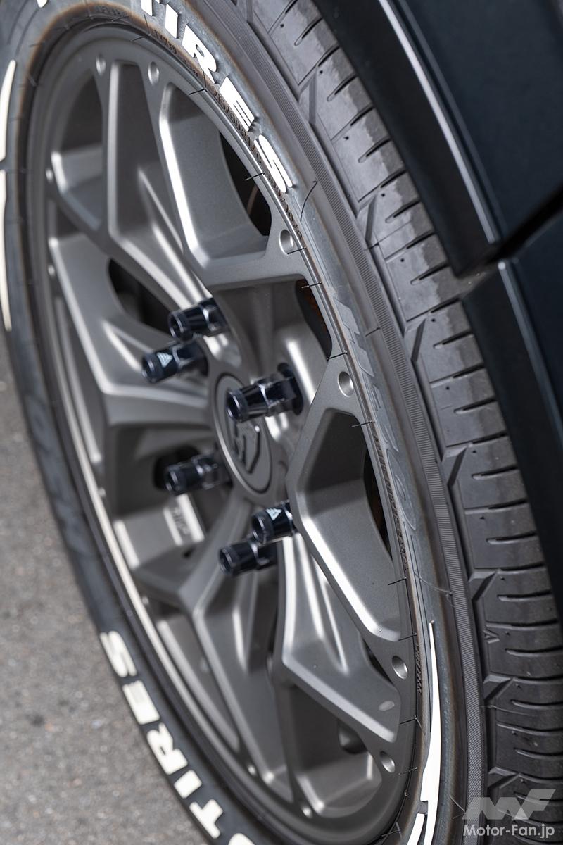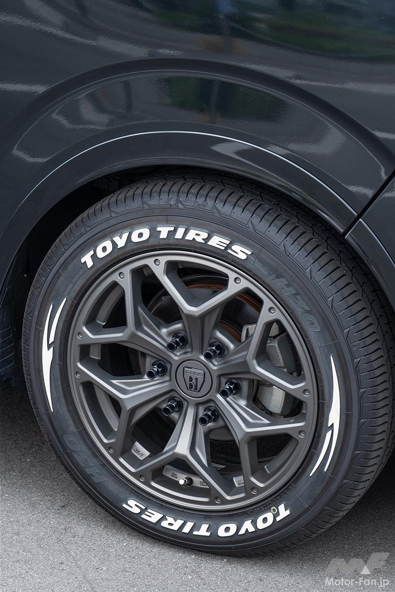 カスタム クセになりそう! 独創的なヘキサゴン意匠 『ハイエース』専用ホイール、バルベロの最新作は立体的で力強さも【写真・13枚目】 ブラックサイドマシニング マットガンブラック ハイエース専用設計の17×6.5J+38というワンサイズ設定。トーヨーH30のようなホワイトレターのLTタイヤもノーマル車高でクリアできるサイズだ。FLEX SIZE 17×6.5J+38 TIRE 215/60R17 COLOR マットガンブラック マットガンブラックは欧州高級車に採用されるシブい輝きの黒がモチーフ。ブラックサイドマシニングは六角形のキレイさが際立つ。 隣り合うスポーク同士の間に生まれる窓は、美しい菱形の六角形でデザイン。スポーク先端にはダミーピアスも配置して高級感も演出。 Y字スポーク先端の内側も、変則的な六角形を描くように造形。すべてが六角形で統一されるためビジュアルバランスが絶妙、高品位。 Y字スポーク側面のエラはあえて広めに設計されているため、全体は細身なのだが力感は強い。ハイエースの車体にも負けない存在感。 センターキャップはシリーズ初となる本体カラー同色仕様。同色だからデザインが途切れず、ディープコンケイブ感もさらに際立つ。 この画像の記事を読む