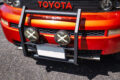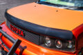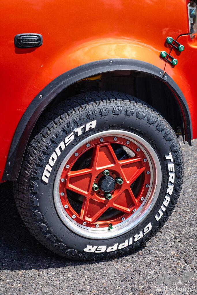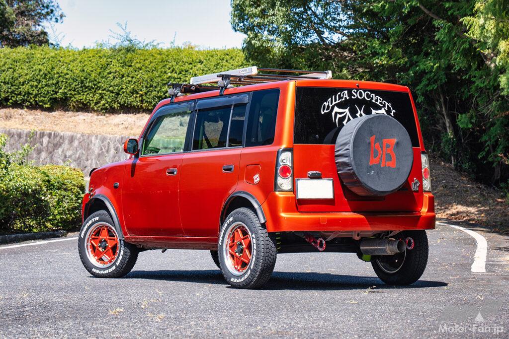 免許を取得して最初に買ったクルマで、当然ながらこれが自身初めてのカスタムだというMk-tanさん。そんな彼がフル自作で挑んだのが「bBはみんなサゲるんで、アゲてみたらオモシロイかも」と思い立った衝撃のアゲbB。スプリング変更にスペーサー、大径タイヤで実現したその高さはなんと純正比で約15㎝アップ。車種不明感とクロスオーバー感を盛り上げるため、フロントのフェイスガードやグリルマーカー、ルーフラックなどを自作でプラスしているのも好感だ。外装が華やかなオレンジなのに対し、内装がグリーン系というギャップも独創的。その姿、まるで海外のbBだ。