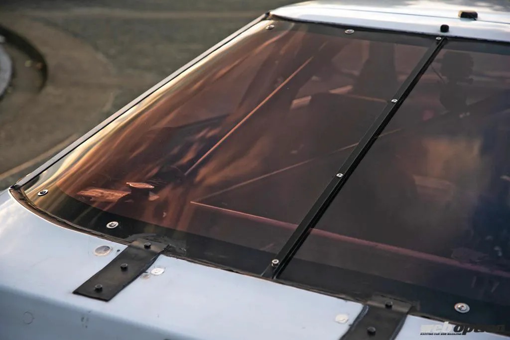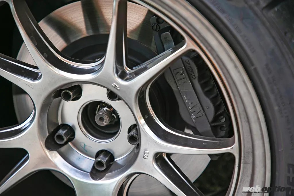 DIYでワンオフ製作した個性的なワイドフェンダーに収まるのは、フロントが10.5Jホイールに295/30-18タイヤ、リヤが9Jホイールに255/40-17タイヤの組み合わせ。フロントよりもリヤタイヤが細いのは、コーナリング時の回頭性を追求していった結果だという。