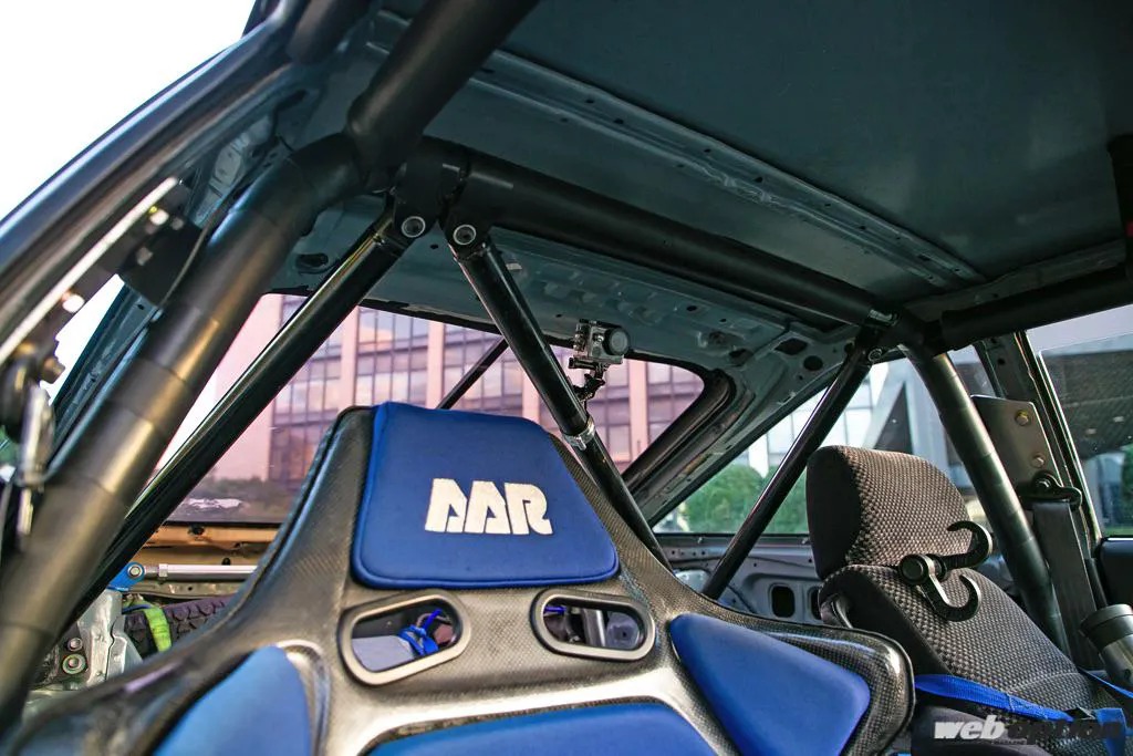 インテリアも走りに徹したものとなっていて、フロアはカーペットやアンダーコート、ドアや内装のパネル類も軽量化のために撤去。安全性と剛性アップのために張り巡らされたロールケージがレーシーだ。