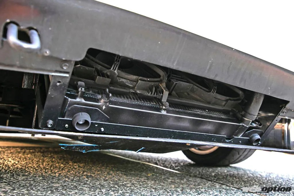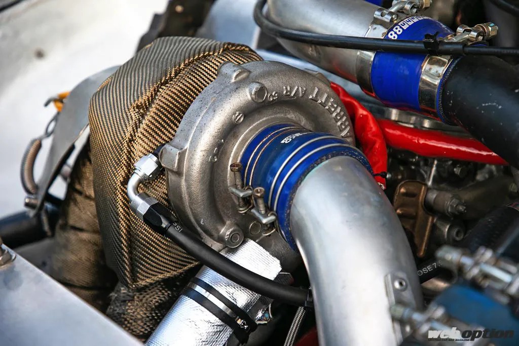 本来ラジエターが収まる位置にはインタークーラーが装着され、ラジエターはリヤへと移設。ベースは古くても、今時のタイムアタックマシンらしいメイキングが各部に垣間見える。
