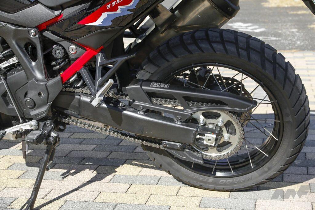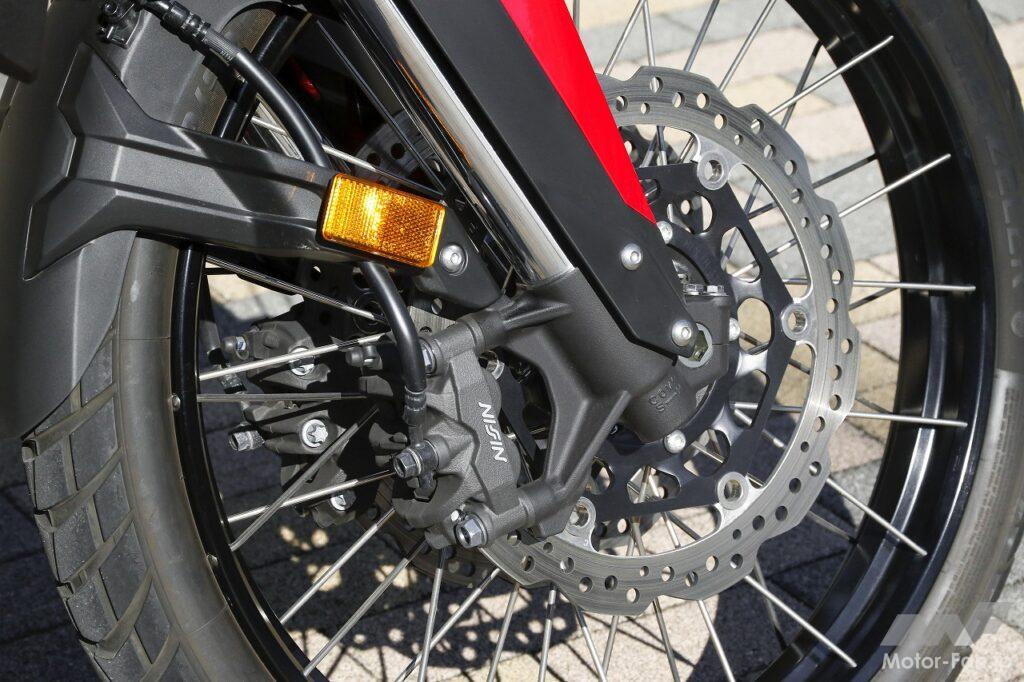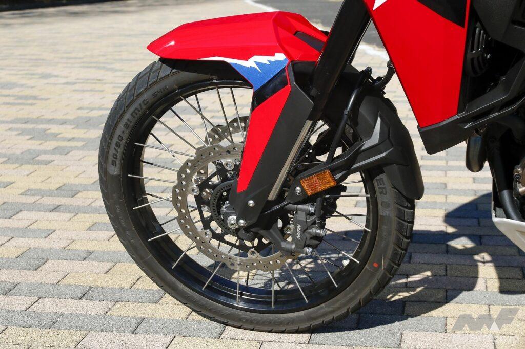 タイヤサイズはフロント90/90-21、リアが150/70R18でともにチューブレスを履いています。<s>はオフロード志向となってはいますが、オンロードが苦手というわけじゃありません。実走してみれば体現できますが、直進性を含めて安定性の高さが特徴です。そうなるとバンク操作に粘りがあってやや重たいんじゃないかと思うかもしれませんが、想像するよりはるかに軽快に身をひるがえしてくれます。もちろん変に軽いのではなく素直なハンドリング特性を実現しているのです。