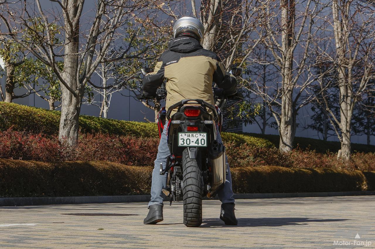オフロード走行を想定したタイプなので車高は高めです。シートは高さを870㎜と850㎜の2段階に調整できます。日本のライダーにはローポジションとなる850㎜にセットしておいたほうが無難だと思います。それでも乗車する際には足を高く上げる必要がありますし、サイドスタンドを払って車体を起こすときには気合もいります。このようにたしかに高いのですが、前後サスペンションの初期作動がソフトなので、シートにどっかりと腰を下ろすと適度に沈み込んでくれて、想像するよりは足つき性は悪くありません。まあこれは平坦な舗装路での話で、足場の悪いダート路ではやはり不安を覚える高さにはちがいありません。