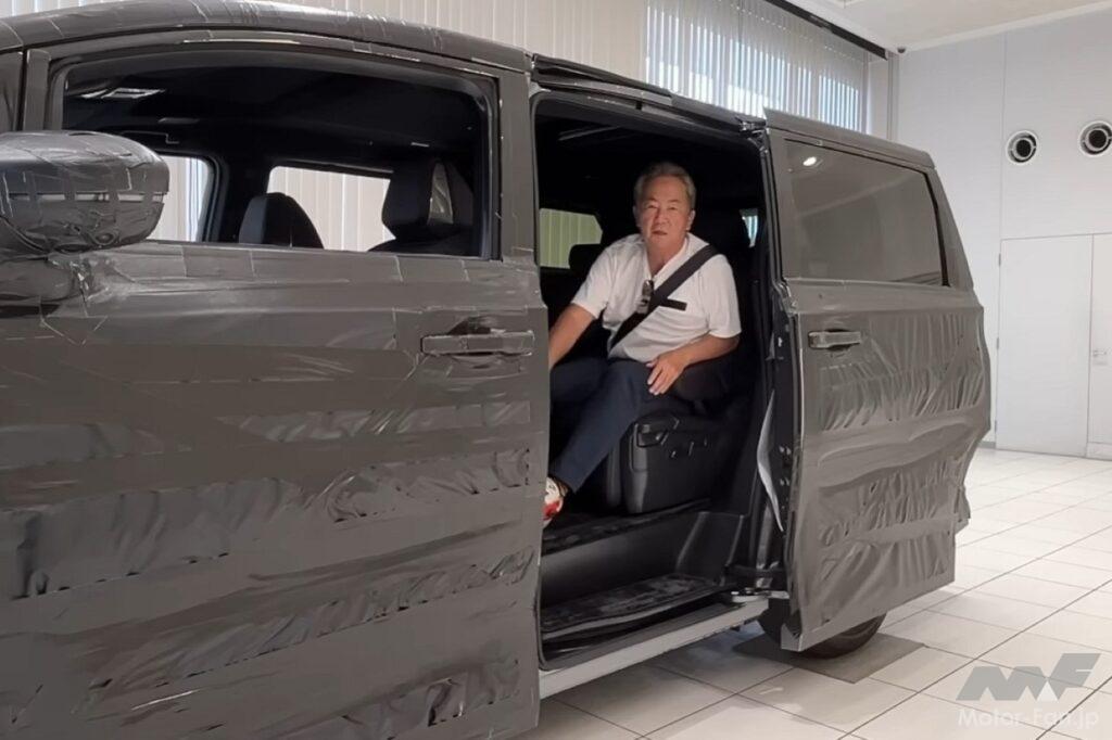 が、今日は実際に走っての2列目シートの乗り心地評価はできず、スタジオで止まっている状態で座り、雰囲気を味わっている。見た感じの空間はやっぱりデカい! 当然、ライバル(アルヴェル、LM等)のミニバンと同じようなサイズだ。