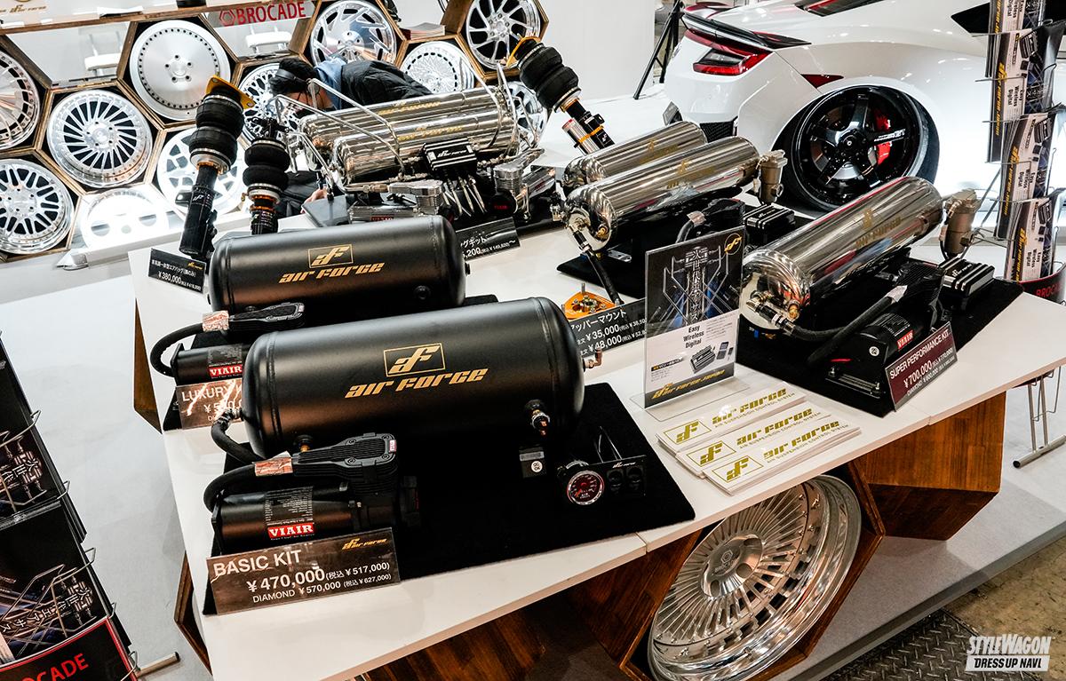車種専用のエアサスキットを展開している「エアフォースジャパン」。クール・クルーズのエアロをセットアップしたアルファードには、ハイエンドモデルとなるダイヤモンドキットを装着。ブースでは上げ下げのデモンストレーションも行い、ギャラリーの注目を集めていた。このダイヤモンドキットはリザーブタンク付きダンパーを採用。より良い乗り味を実現するおすすめのシステムだ。さらに軽キャンピングカーやハイエース、ハイラックスなど、リア荷重が大きいクルマの乗り心地をよくできるサポートアイテムとして「エアサポ」というキットを新展開。サスペンションを交換するのではなく、エアバッグを追加して底付きなどを解消できるシステムだ。エアバッグキットの価格は15万円〜で、コンプレッサー&メーターなどのシステムが9万7900円。こちらも要注目!