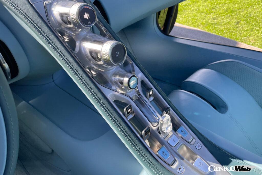 インテリアは、車名の由来にもなっている機械式時計における3大複雑機構のひとつ“トゥールビヨン”を想起させるデザインとなっている。ステアリングホイールとメータークラスターは、スイスの時計職人が設計から手掛け、チタンやサファイア、ルビーなど600以上のパーツで組み上げられた、まさにタイムレスでこれ以上無いオーセンティックな仕上がりと謳っている。センターコンソールには、アルミとボヘミアンガラスを組み合わせた縦長のコントロールパネルが特徴的だ。