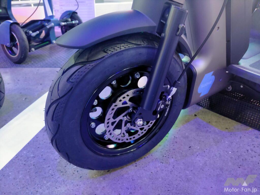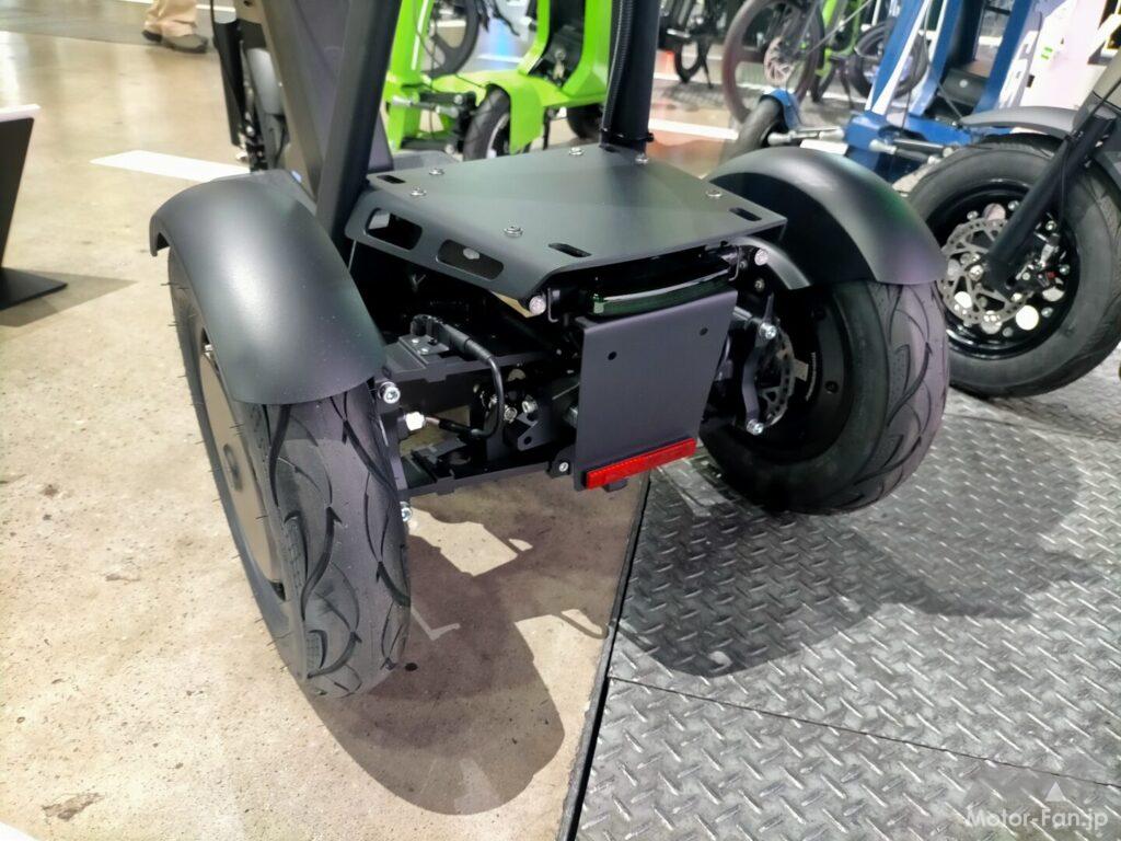 Swakeのポイントは、ステップボードなどの車体だけでなく、駆動部となるリア周りも連動して傾斜すること。同システムの導入により、スムーズなコーナリングを獲得。独自の操作性をアピールするため、会場では試乗会も開催された。