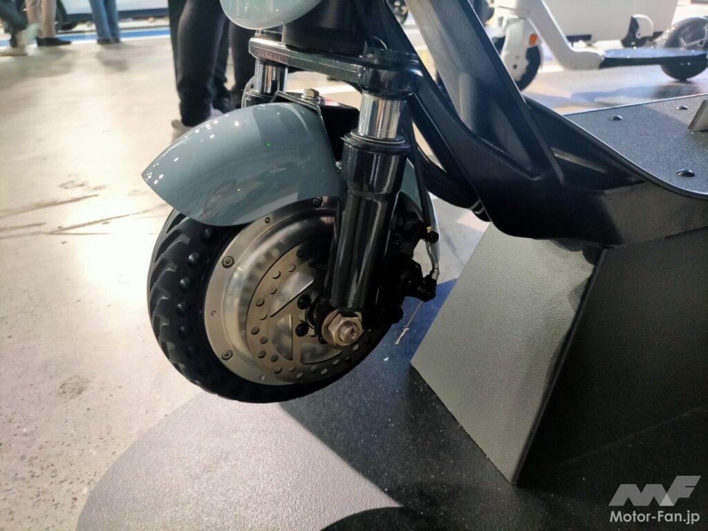 前後ホイールは小回りの利く超小径型とし、前後ブレーキは制動力の高いディスク式を採用。フロントには正立フォーク、リアには独自の衝撃緩和機構を導入し、良質の乗り心地と優れた走行安定性を獲得。