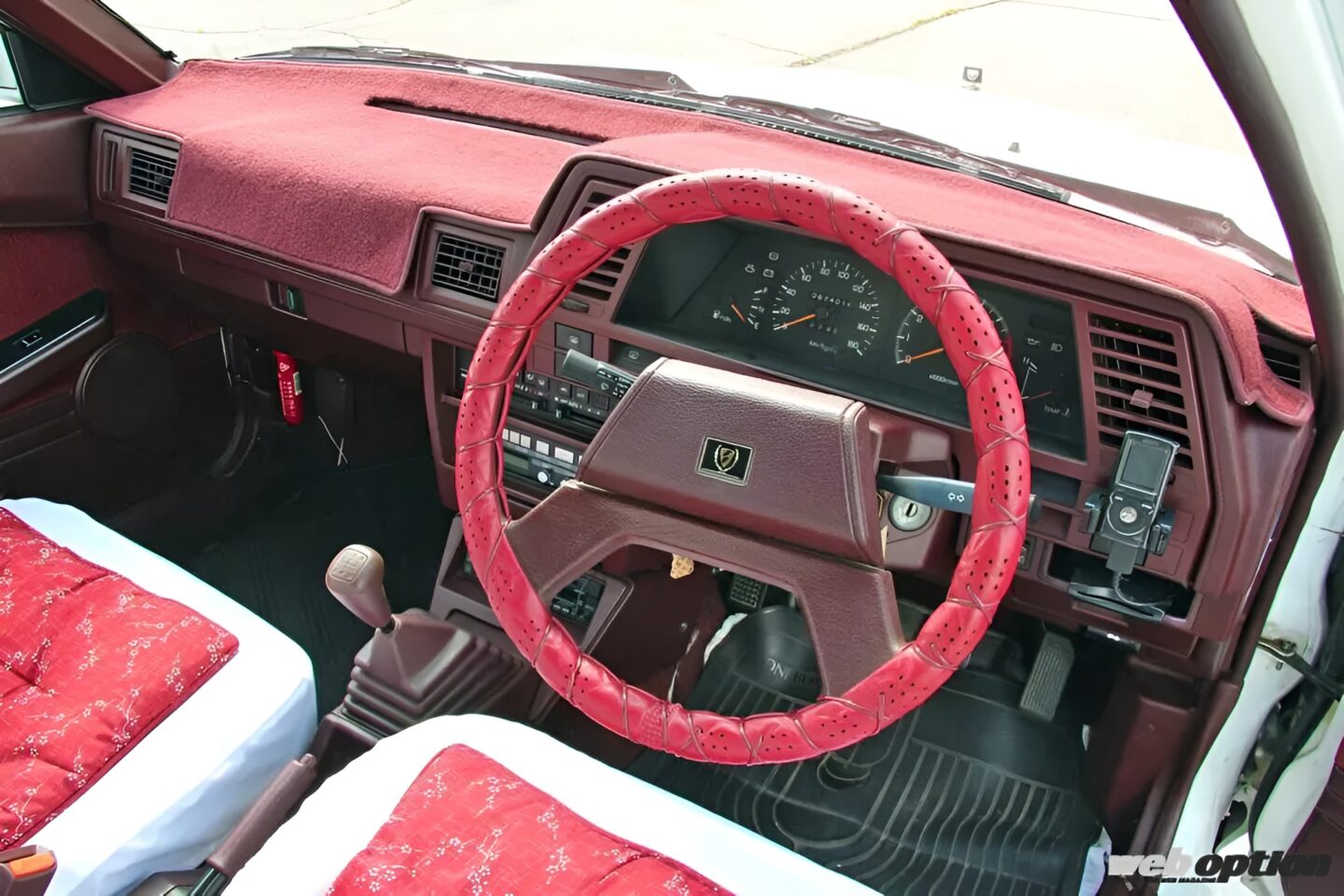 一方の内装は、この時代のトレンドだったワインレッド基調。マークII三兄弟が火を付けたハイソカーブームにならっているのは明らかだろう。ダッシュボードの形状やデザインは基本的にトラッドサニーと同じ。ダッシュボードの劣化を防ぐマットは、ステアリング位置の関係から、北米のサニー(セントラ)用を左右反転して作ってもらったワンオフ品だとか。