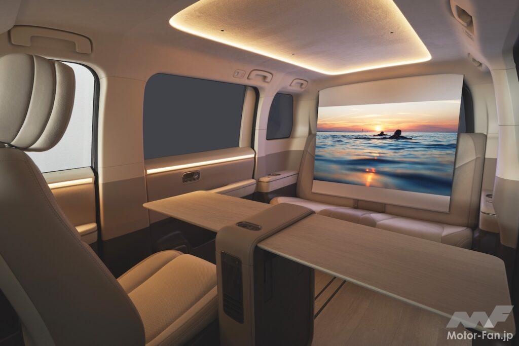 では、どの部分が“シャープらしい”のか。答えは車内装備にある。トールワゴンタイプのコンパクトEVの車内には、運転席・助手席の回転機能、プラズマクラスター搭載のエアコントロール(空調システム)、テーブル一体型プロジェクターとロール式スクリーンなどが備わる。車載電源を活かし、駐車中の車内をくつろぎ空間やビジネススペースとして活用しようという提案だ。
