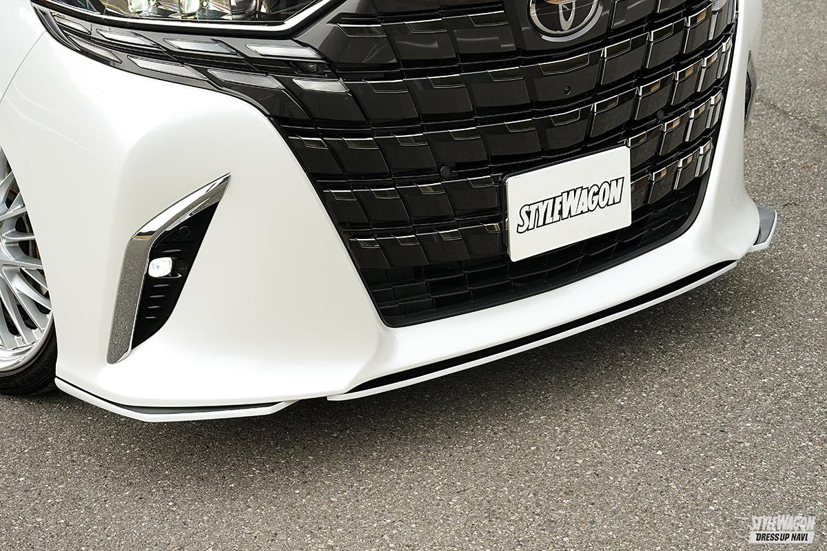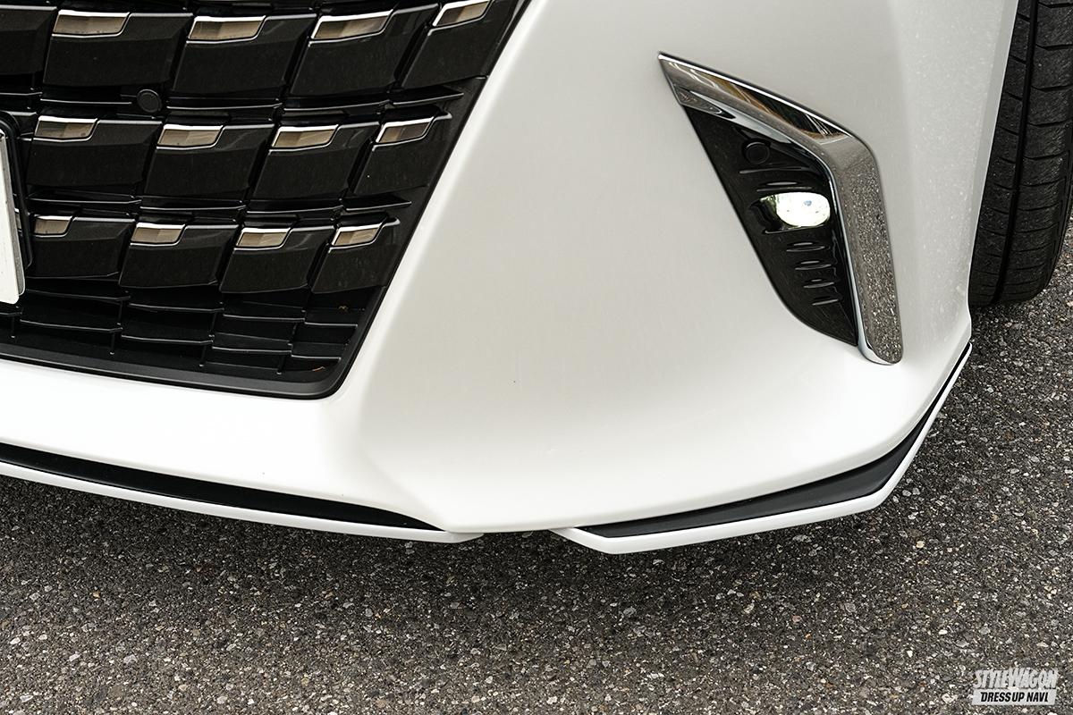 純正フォルムを崩さないナチュラルな装着感を実現する薄型フラップタイプで、前後のスポイラーはセンター部分と左右コーナー部分で3分割式となっているのが特徴。フロントボトムはその分割部分がうまく作用して、少しえぐられたくぼみがオリジナリティ度をアップ。スポーツテイストもプラスしている。