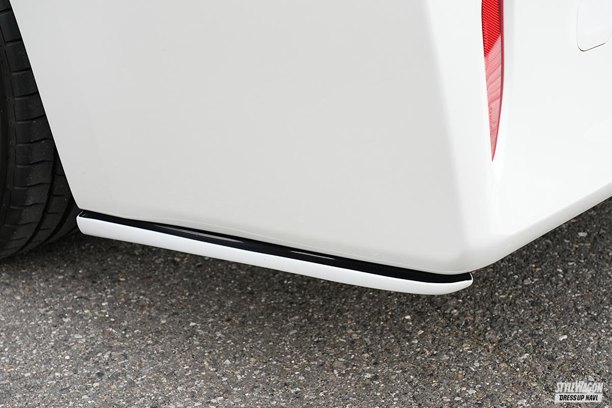 フロントとリアのボトムラインを合わす厚みで設定されたサイドステップは1本もので、絶妙な出幅でアクセントになっている。リアは5つのフィンをデザインしたセンター部と、コーナー部の3ピース構成。サイド同様に絶妙な出幅で、上面だけ黒で塗り分けしてフィニッシュ。