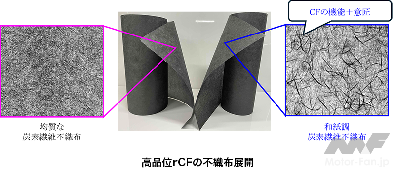 本技術で得たrCFは、従来rCF対比強度が高く、後加工プロセスでの繊維折損が少ない特徴がある。さらに、樹脂残渣が少なく表面品位に優れることから、より幅広い用途への加工が可能。なかでも、短繊維を分散させてシート状に加工する不織布への検討が進められた結果、本技術で得られたrCFは水への分散性が容易に制御でき、均質形態の不織布や、従来にない和紙の風合いを有する不織布の作成に成功した。この和紙調炭素繊維不織布は炭素繊維の機能性(電波遮蔽や熱伝導性など)と和紙の意匠性を兼ね備えた新素材として、幅広い分野への展開が目指されていく。