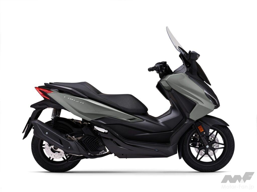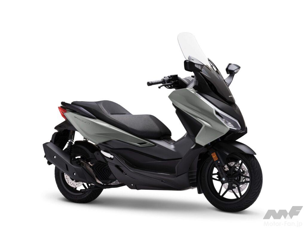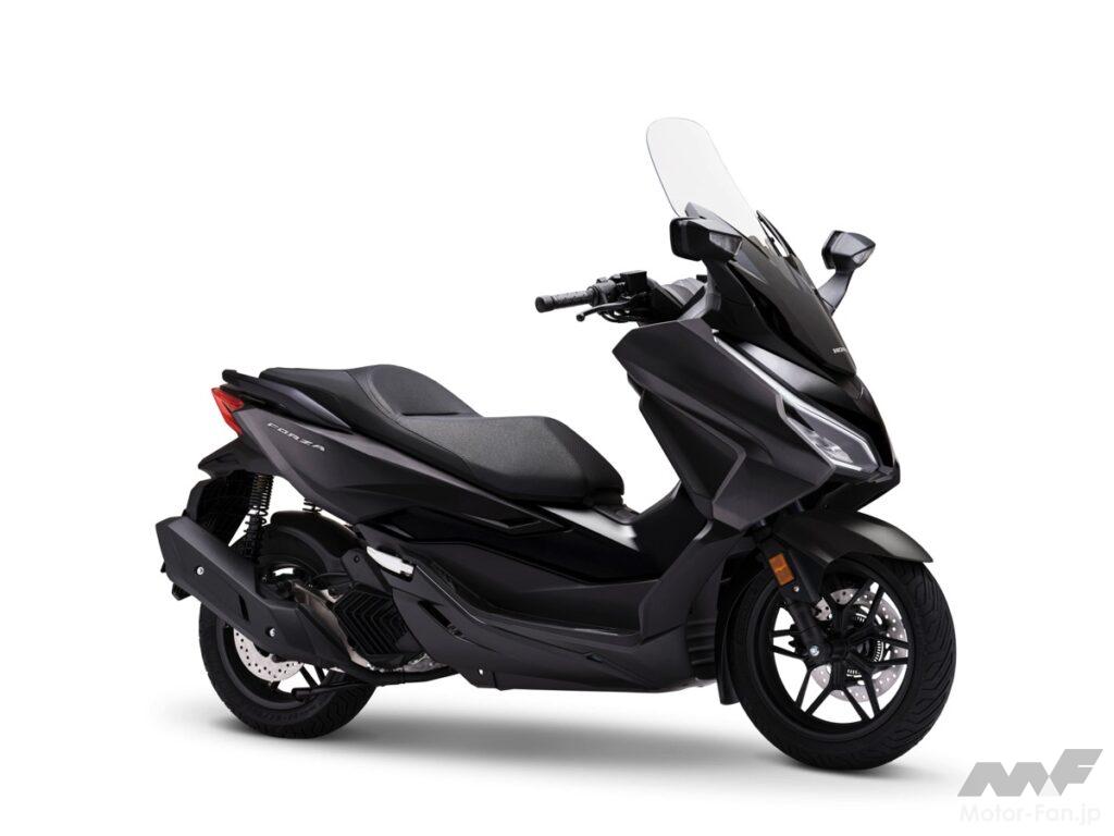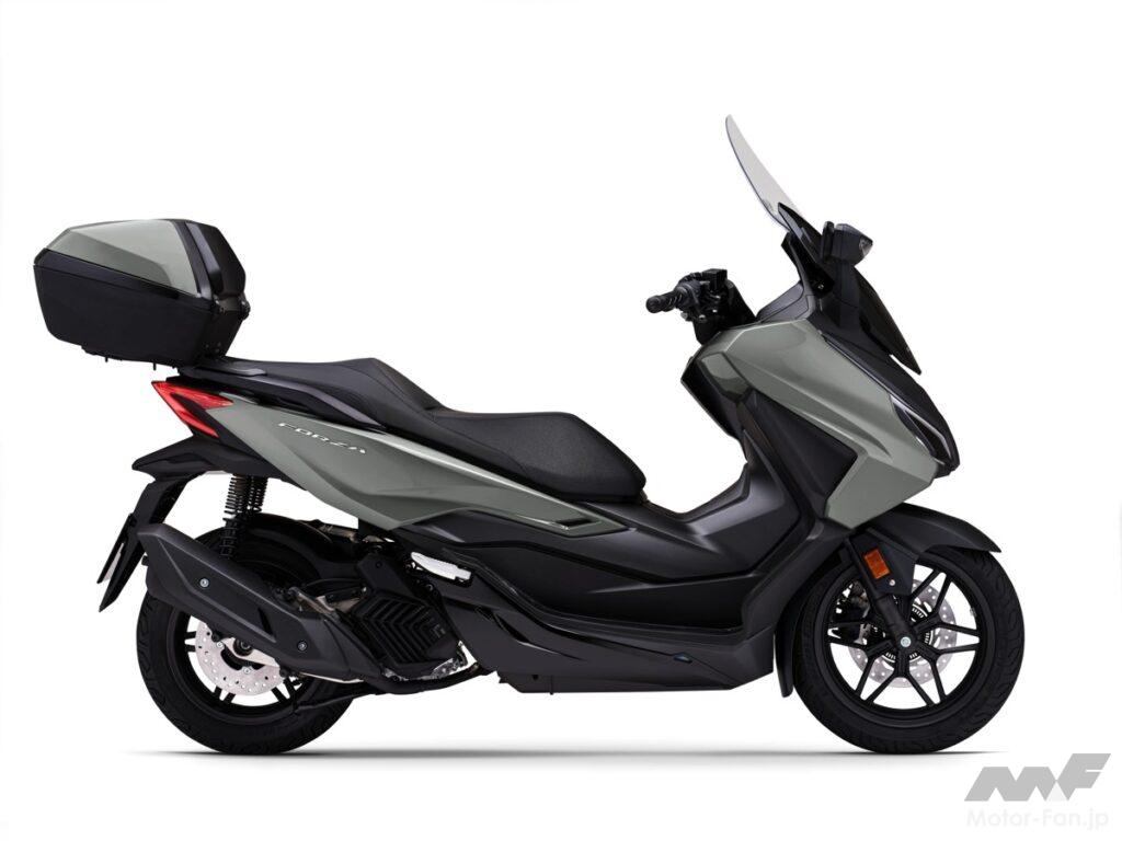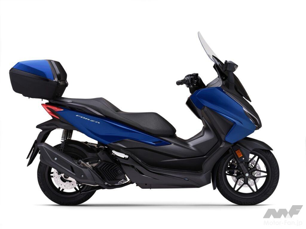 また、15インチ前輪・14インチ後輪という設定により、GTスクーターとしての風格を保ちつつ、取り回しの良さを確保。ブレーキも前256mm/後240mmのディスクを備え、安心感ある制動性能を提供している。 外観では、レンジトップモデルのForza 750と共通イメージを内包する鋭角的フェアリングとLEDヘッドライトを採用し、プレミアムな質感を強調している。