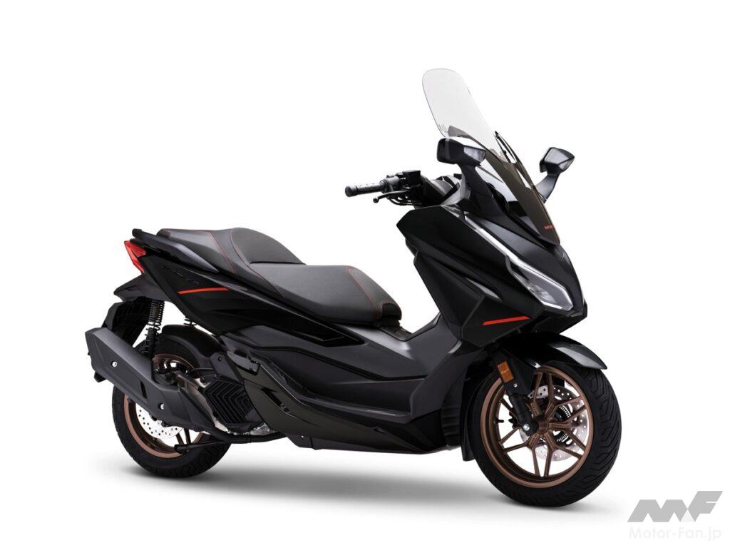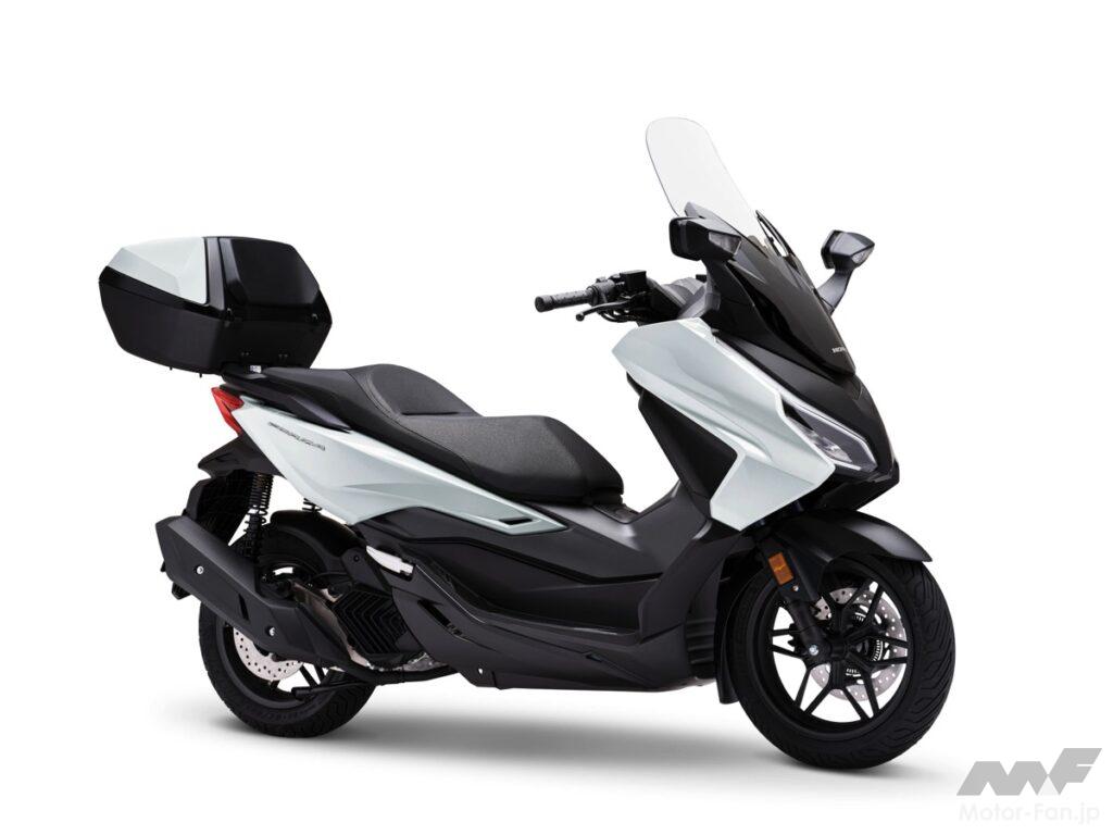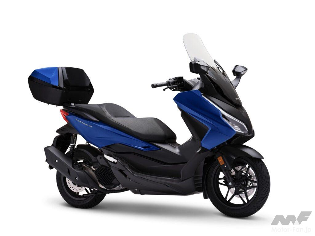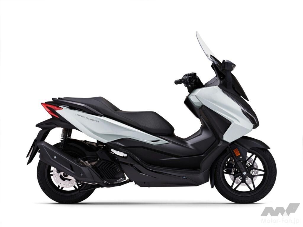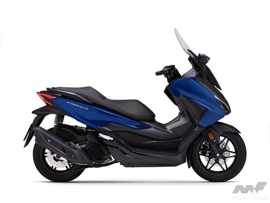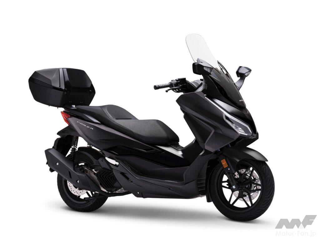 また、15インチ前輪・14インチ後輪という設定により、GTスクーターとしての風格を保ちつつ、取り回しの良さを確保。ブレーキも前256mm/後240mmのディスクを備え、安心感ある制動性能を提供している。 外観では、レンジトップモデルのForza 750と共通イメージを内包する鋭角的フェアリングとLEDヘッドライトを採用し、プレミアムな質感を強調している。