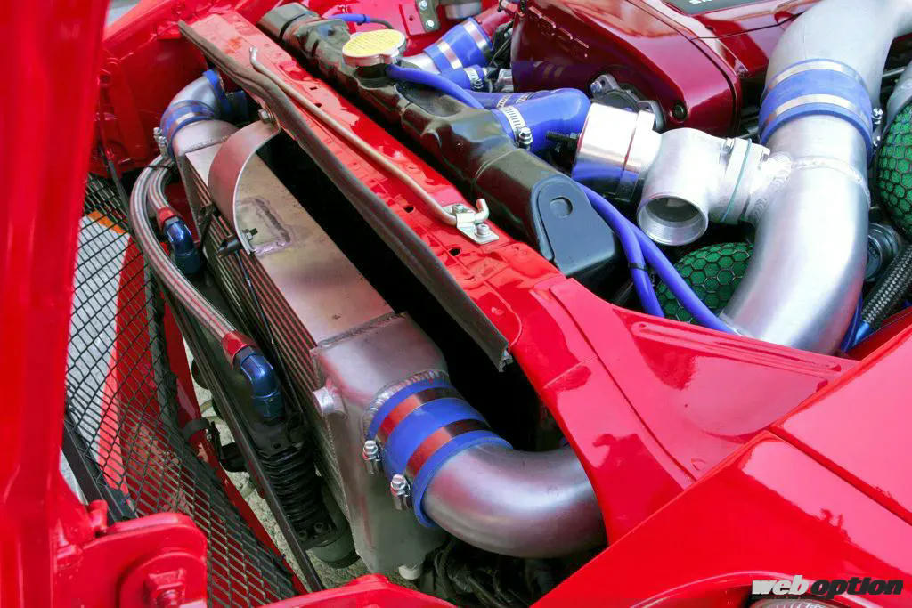 心臓部はL型ではなく、第二世代GT-RのRB26DETTを換装。ミッションがRB20用5速ということもあり、出力面はブーストアップに抑えられているが、それでもL型フルチューンを凌ぐ動力性能を手にしている。マネージメントは、ハーネスを引き直してF-CON Vプロによる完全フルコン制御としている。