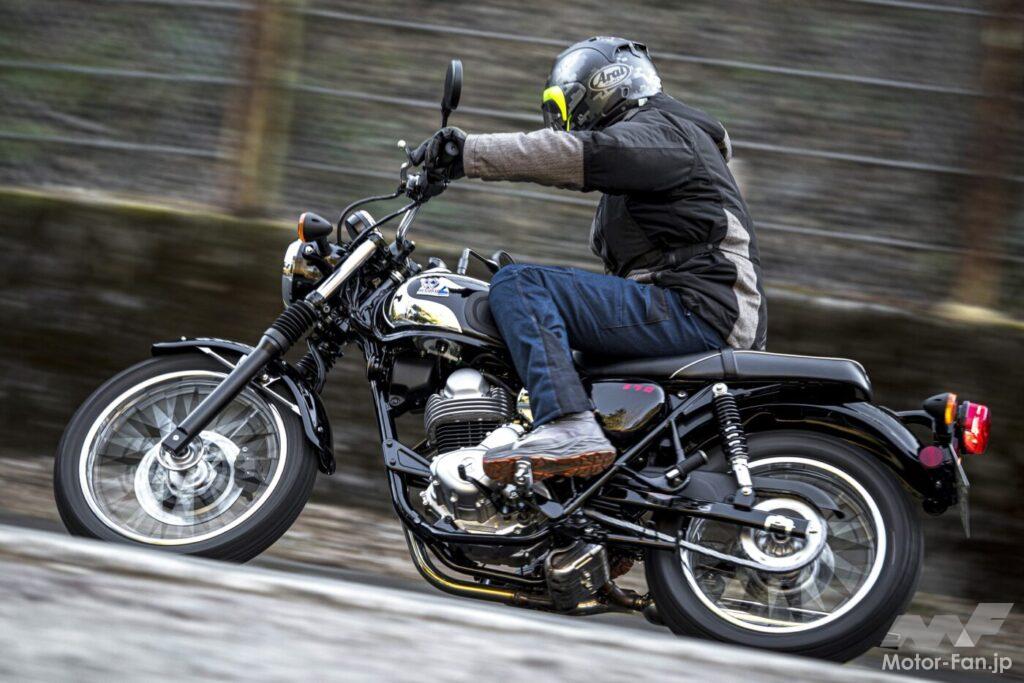 走り始めてすぐに感じたのは、サスペンションの動きが限りなく旧車に似ているということだ。具体的には、それほど大きくないギャップでもクシュッと沈み込み、その傾向は特にリヤの方が強い。スプリングレート、減衰力ともに低めということになろうが、これによって生み出される乗り心地の良さは、筆者が4年前に試乗した500メグロK2にそっくりなのだ