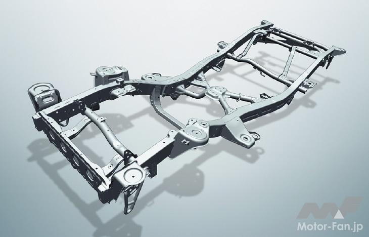 もちろんこれらの優れた特徴は継承されただけでなく、ラダーフレームにはX(エックス)メンバーと前後にクロスメンバーが加えられて、ねじり剛性が先代モデルより約1.5 倍向上、車体とラダーフレームをつなぐボディマウントゴムが新設計されて乗り心地が改善され、優れた操縦安定性が実現されています。