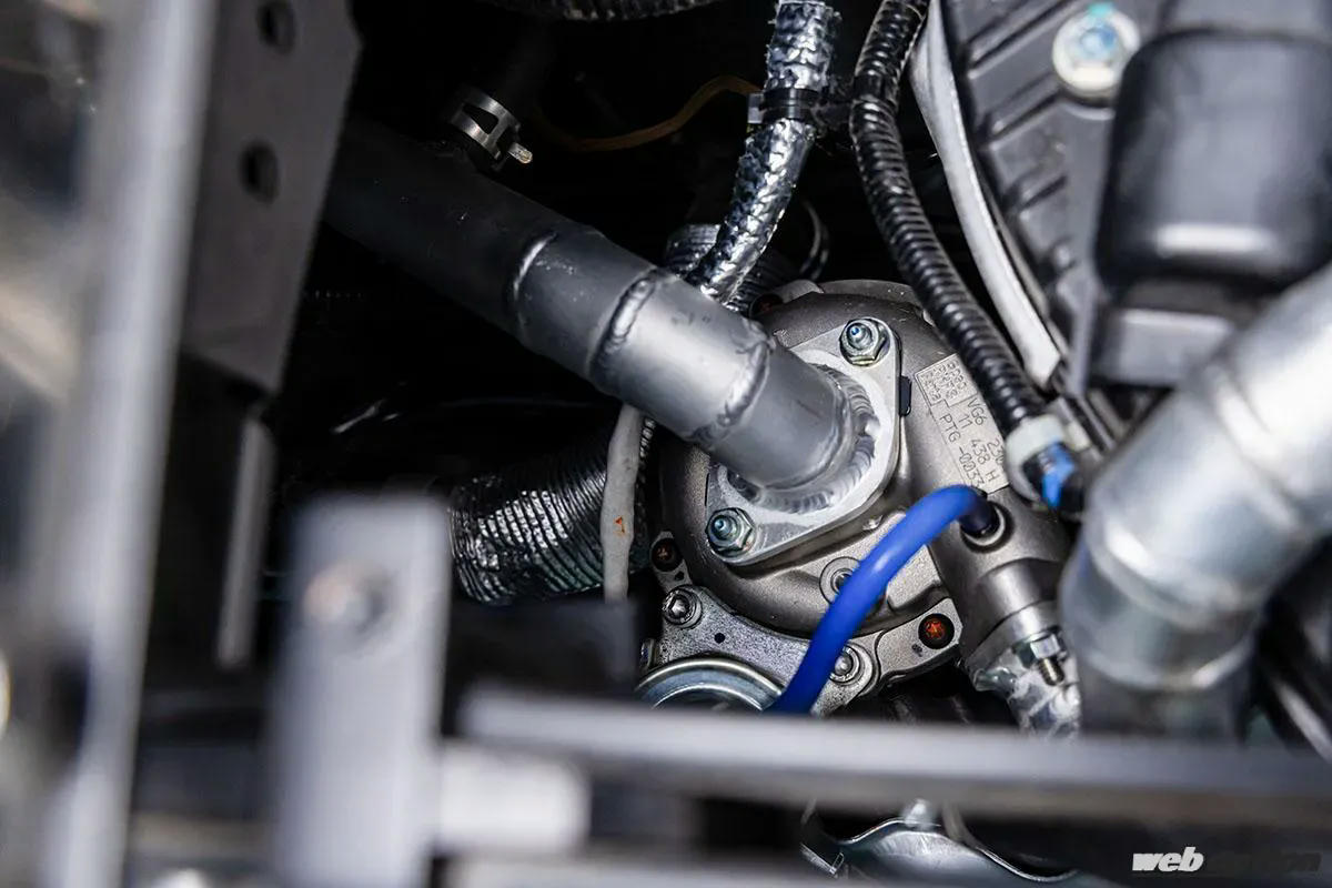フロア下に水平マウントされたインタークーラーは、トラストのコアを使ったワンオフ品。インタークーラーの上に確認できるのはブローオフバルブだ。