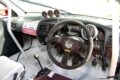 内装パーツが全て撤去され、7点式ロールケージが覆い尽くす室内は超スパルタンな仕上がり。エアコン付きながら車重は約1100kgまで抑え込まれている。