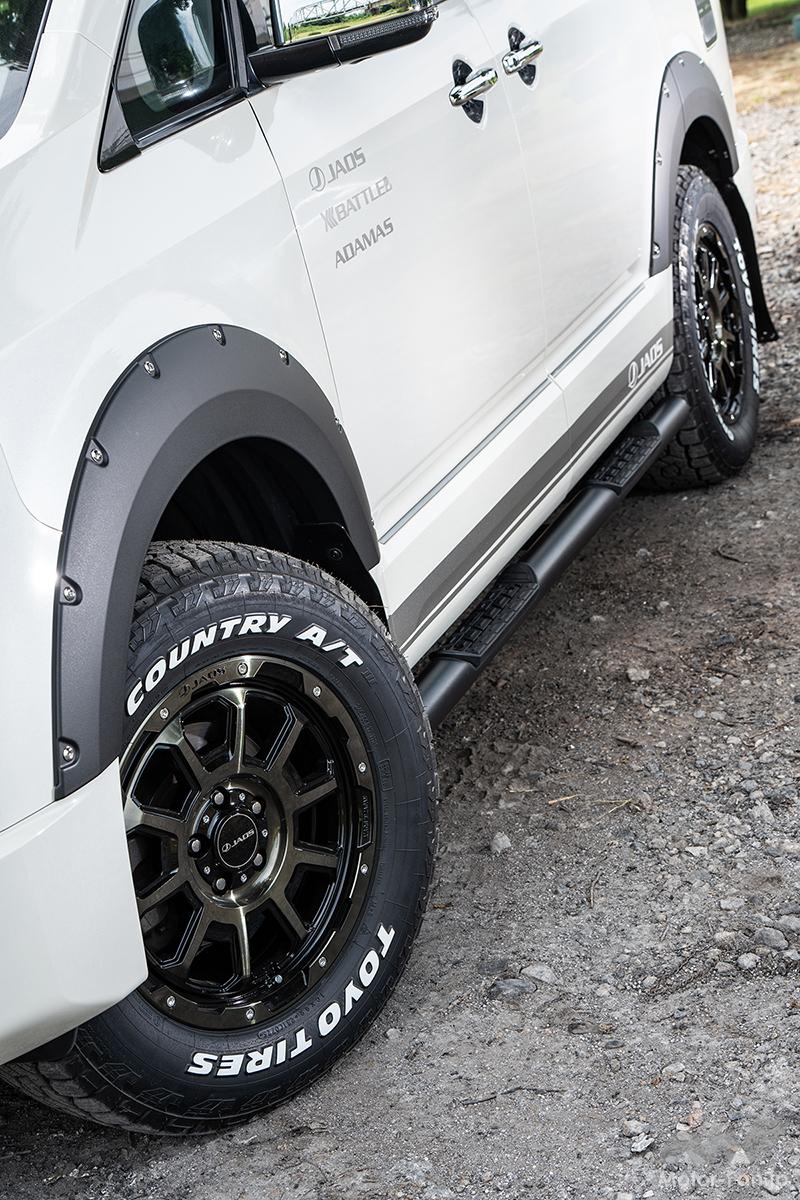 カスタム カスタム好きの満足度を爆上げ!ジャオスの『デリカD:5』は、豊富すぎる専用パーツで個性を猛アピール!!【写真・2枚目】 SPECIFICATION フロントバンパーガード(マットブラック) 9万2400円 フロントグリル(マットブラック) 8万8000円 ボンネットプロテクター 3万800円 フラットラックセット 1250×1920(ロータイプ) 17万6000円 フェンダーガーニッシュ type-S(運転席側) 5万9400円〜 フェンダーガーニッシュ type-X(助手席側) 8万5800円 サイドステップ(ブラック) 9万6800円 ルーフスポイラー type-B(マットブラック) 7万2600円 リヤラダーAL 8万5800円 リアスキッドバー(ブラック/ブラスト) 7万4800円 ドアハンドルプロテクター(カーボン調/ジオメトリック) 各6600円 フューエルリッドプロテクター 5500円 バックドアスカッフプロテクター 7700円 マッドガードⅢ専用セット 各1万6500円(フロント/リア) サイドデカール 1万1000円 ステッカー M 2200円 エンブレム ハイボスカル 2200円 BATTLEZエアクリーナー(DT用) 9680円 BATTLEZ マフラー ZS-S 5万2800円 BATTLEZ リフトアップセット VFCA 18万2600円 ■ホイール/ジャオス・アダマス BL5(17×7.5+40) 4万8400円~5万3900円 ■タイヤ/トーヨータイヤ・オープンカントリーA/TⅢ(245/65) フロントバンパーガードの塗装済みは、マットブラックとガンメタの2色で塗り分け(未塗装品も設定)。2個のLEDランプはその他の灯火類扱いのため、車検も問題なし。 スチール製の極太パイプにカチオン電着塗装とブラック粉体塗装を施し、耐久性を向上。ステップ部は耐候性と実用性を両立した高品質インジェクション成形樹脂を使用。 ステンレスのバーとロゴ入りプレートがセットになったリアスキッドバー。バー本体はブラックとポリッシュ、プレートはブラックとブラストの2種類からセレクトできる。 フラットラックへのアクセスに欠かせないリアラダーAL。軽量で耐久性に優れたアルミ素材を使用し、リアゲートの開閉もスムーズ。 ロア部分の印象も変わる一体成型のフロントグリル。3個のオリジナルLEDランプがアメリカンなムードを演出する。 ルーフスポイラータイプBは、リアまわりに躍動感を与える4本足風デザイン。マットブラック塗装済みも設定あり。 軽量&強固なアルミ押し出し材を使用したフラットラック。日本製で品質の高さもポイント。オプションパーツも豊富。 車種に合わせてカット済みのマッドガードと取り付け用部品をセットにしたマッドガードⅢ。フロント·リア用を設定。 ダミーピアスを配したビードロック風リム形状が特徴のアダマスBL5。独特の5スプリットディッシュスポークで力強さもアピール。 右サイド出しのバトルズマフラーZS-S。排気が横に行くため、後方での作業やヒッチメンバーを装着したクルマに最適。 デモカーの足まわりは、ダンパーに微振動を吸収するハーモフレック機構を内蔵したバトルズリフトアップセットVFCA。 この画像の記事を読む