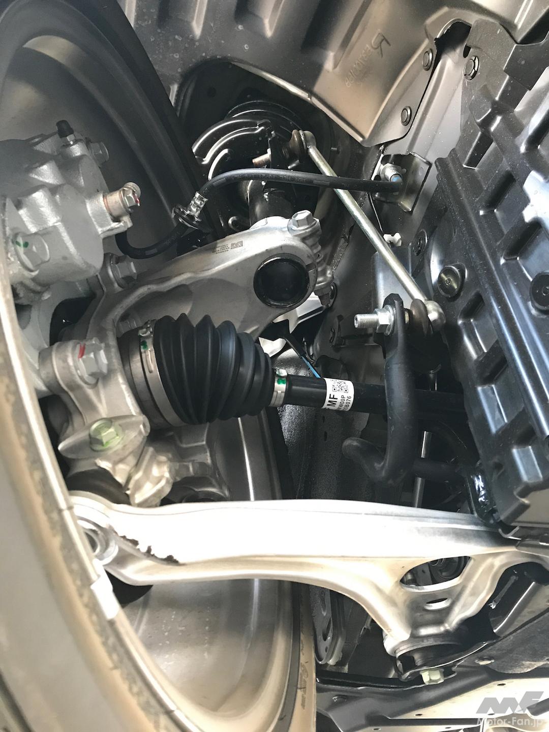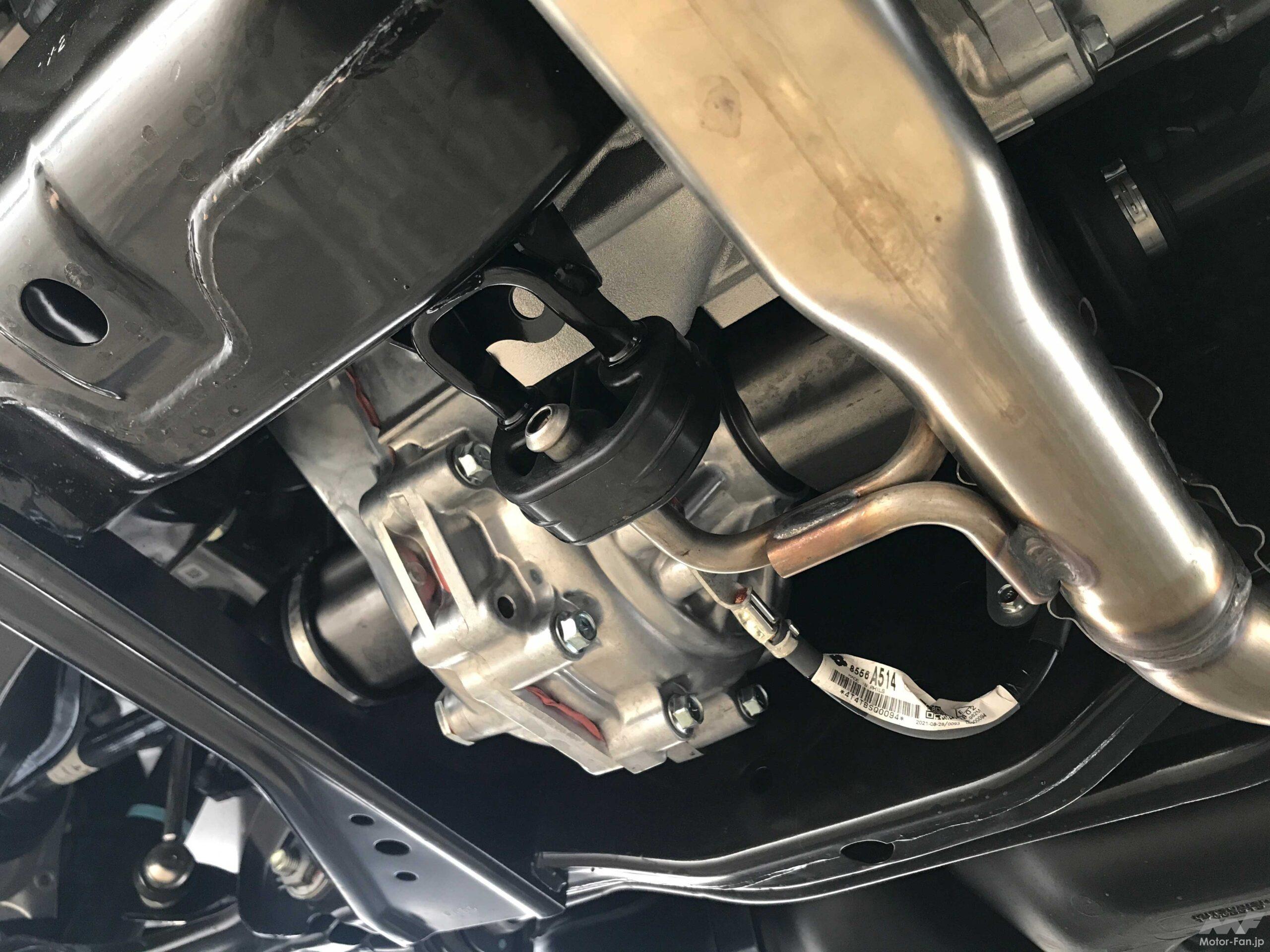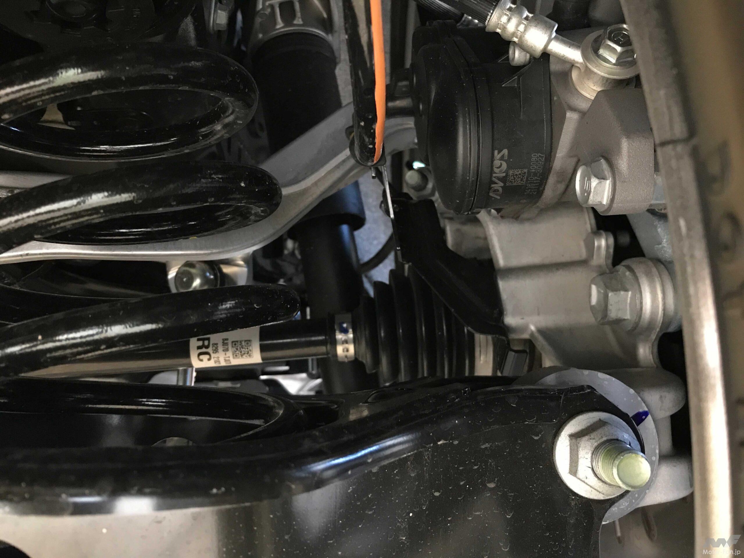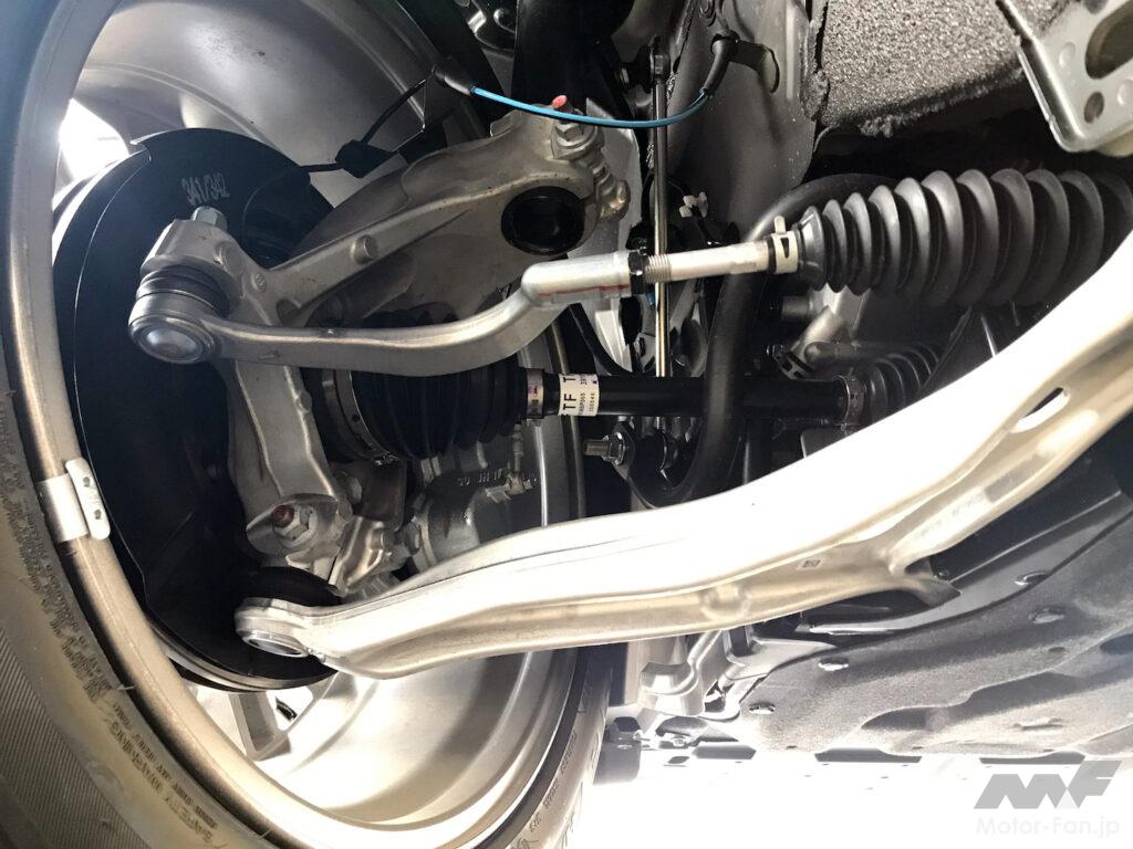 自動車ニュース テクノロジー プレスリリース 車の知識 アウトランダーPHEV 三菱・新型アウトランダーPHEV(GN0W型)のサスペンションを眺めてみる 2022.02.02 15:15 by Motor Fan illustrated編集部 この記事の画像をもっと見る(全13枚) 三菱自動車のアウトランダーがフルモデルチェンジを果たした。今回はPHEVモデルのみの展開(日本仕様:2022年2月現在)。乗る前にじっくりとサスペンションをじっくり眺めてみた。 連載サスを眺める INDEXリヤサスペンションフロントサスペンション リヤサスペンション リヤサスペンション全体を後左方から。ダブルウィッシュボーン型のマルチリンク式。手前に写る大きな筒はリヤサイレンサ。その奥にリヤモータユニットが見える。ご存じ、MMCのPHEVシステムはAWD駆動方式であり、前後モータを備えるプロペラシャフトレス。 右側のリヤサスペンションを後方から。ロワリンクのリヤ側は舟形形状でばねを収める。同じくロワリンクのフロント側はI(アイ)断面形状で、ショックアブソーバをマウントする。素材はともにスチール製の板金工法。後端にサブフレームのマウント部が見て取れる。サブフレームを横断する管はモータ水冷用のクーラントパイプ。排気管は車両の右方を通すレイアウト。 なぜ排気管が車両右方を迂回するかというと、車両中央にはバッテリパックが備わるため。写真は後方から眺めたところ。パックのうしろは燃料タンク。写真手前には冷却水のセンド/リターンのパイプが見て取れる。 右側のリヤサスナックル部。ドライブシャフトの上にはアルミ合金製のアッパーリンクが見える。キャリパにADVICSの記載を確認、本車の技術トピックのひとつである協調回生ブレーキのキーデバイスである。 同部位を上から見たところ。アッパーアームの形状と配置が見て取れる。ショックアブソーバは内傾かつ前傾配置。 右側リヤサスを前方から。ショックアブソーバを横切り、ナックルから短く伸びるのはトーコントロールリンク。アッパーアームは下開放の皿形状であることがこの角度からわかる。そのアッパーアーム前端に短いリンクを介し、アンチロールバーが接続されている。 リヤデファレンシャル部。形式はFR車と同様の機械式で、差動制限機構は備わらない。これのうしろ(写真では左上側)にYA1型駆動モータが備わる。 フロントサスペンション 右側フロントサスペンションを前下方から。形式はマクファーソンストラット式。ロワーアームはアルミ合金製。ブッシュ配置は(写真では見えないが)前側がホリゾンタル、後側がバーチカル。前側のブッシュは非常に小さくソリッドな印象。 同部位を少し上から見たところ。ストラットボディから長いリンクを介してアンチロールバーを接続する。 左側フロントサスを後下方から。ナックルはアルミ合金製で複雑な形状としている。タイロッドエンドもアルミ合金製で、最大舵角時の逃げを湾曲構造で作る。ボールジョイントはロワーアーム/タイロッドエンドともに上向きピン配置。 同部位を少し上から見る。ドライブシャフトとステアリングラックの位置関係はこのような感じ。ドラシャを上手によけてアンチロールバーが配置される(というか、あいているところを縫うように設置せざるを得ない)。 試乗車の装着タイヤはブリヂストンのECOPIA H/L422 Plus。サイズは255/45R20、指定圧は前後ともに250kPa。 連載 サスを眺める プレスリリース 2023.01.29 トヨタ・ランドクルーザー[300系]のサスペンションを眺めてみる テクノロジー 2023.01.28 日産・新型セレナ[C28型]のサスペンションを眺めてみる テクノロジー 2023.01.27 レンジローバーのサスペンションを眺めてみる テクノロジー 2023.01.26 日産アリアのサスペンションを眺めてみる テクノロジー 2023.01.25 日産フェアレディZのサスペンションを眺めてみる テクノロジー 2022.07.20 トヨタ・新型クラウン(クロスオーバー)のサスペンションを眺めてみる 連載の記事一覧へ テクノロジーの関連記事 三菱 アウトランダーPHEVの厳選中古車物件情報 中古車トップ 【注意】 自動車カタログ・厳選中古車情報に掲載されている写真は、年式やグレードの違う車種が含まれます。掲載されている写真はそれぞれの車種用でないものも含まれています。また、対応は年式やグレード、 装備などにより異なる場合があります。購入の際は必ずご確認ください。 商品の価格・仕様・発売元等は記事掲載時点でのものです。商品の価格は本体価格と消費税込みの総額表記が混在しております。商品を購入される際などには、メーカー、ショップで必ず価格・仕様・返品方法についてご確認の上、お買い求め下さい。 購入時のトラブルについて、出版元・編集部は一切関知しません。また責任も負いかねます。