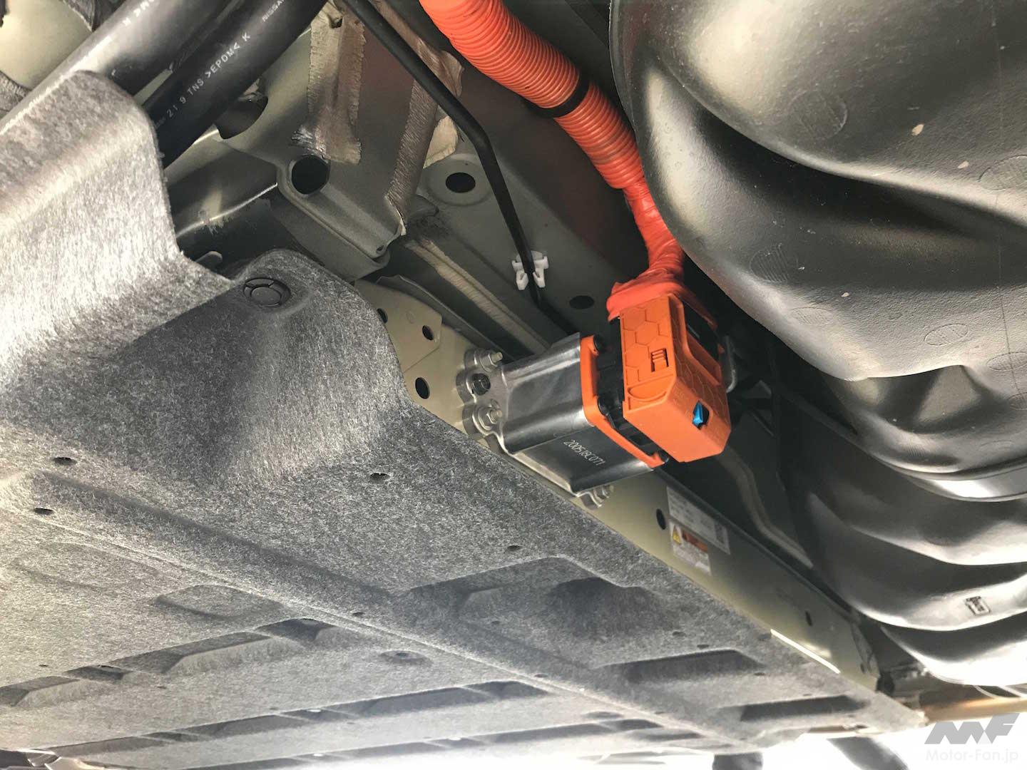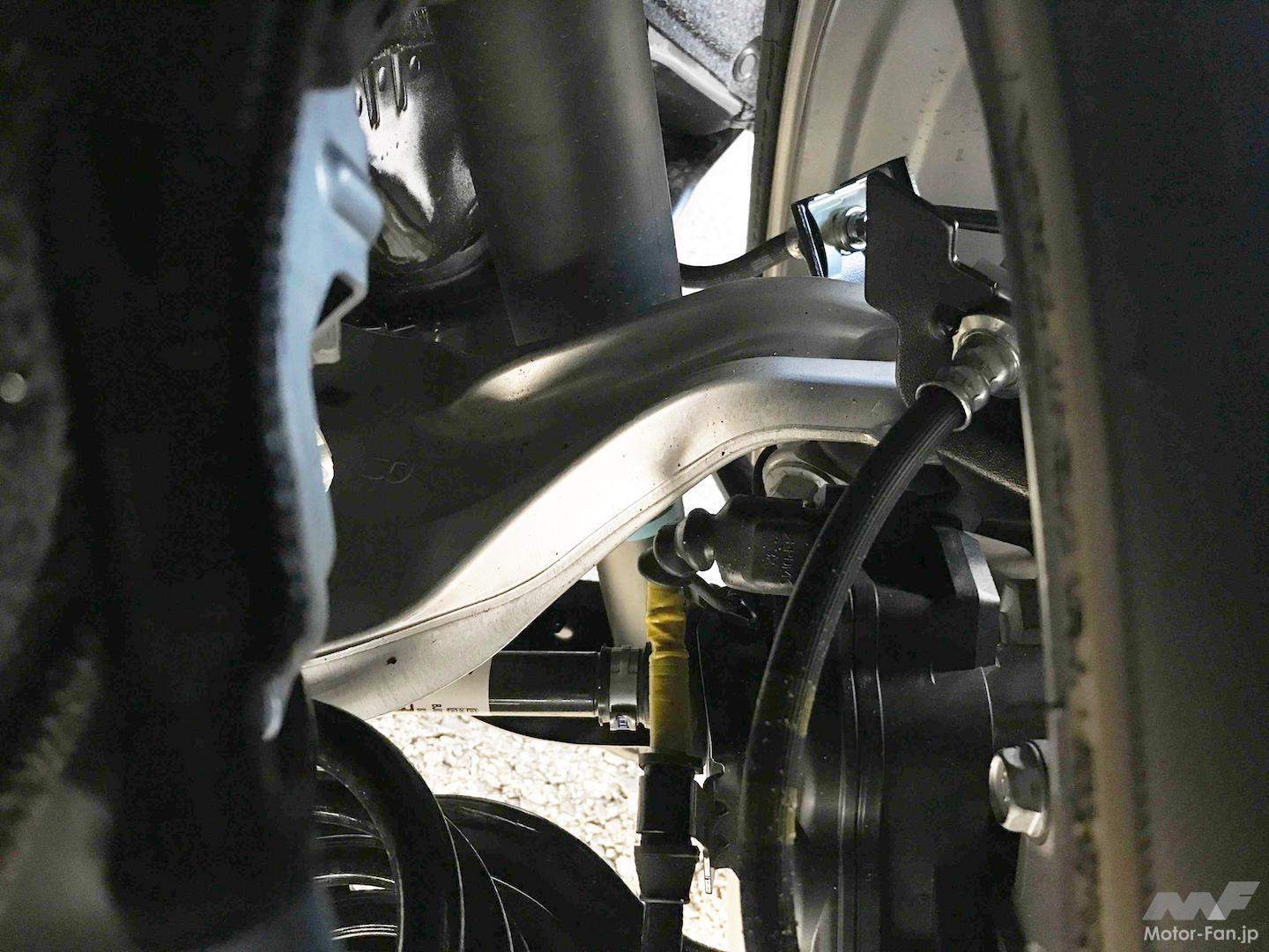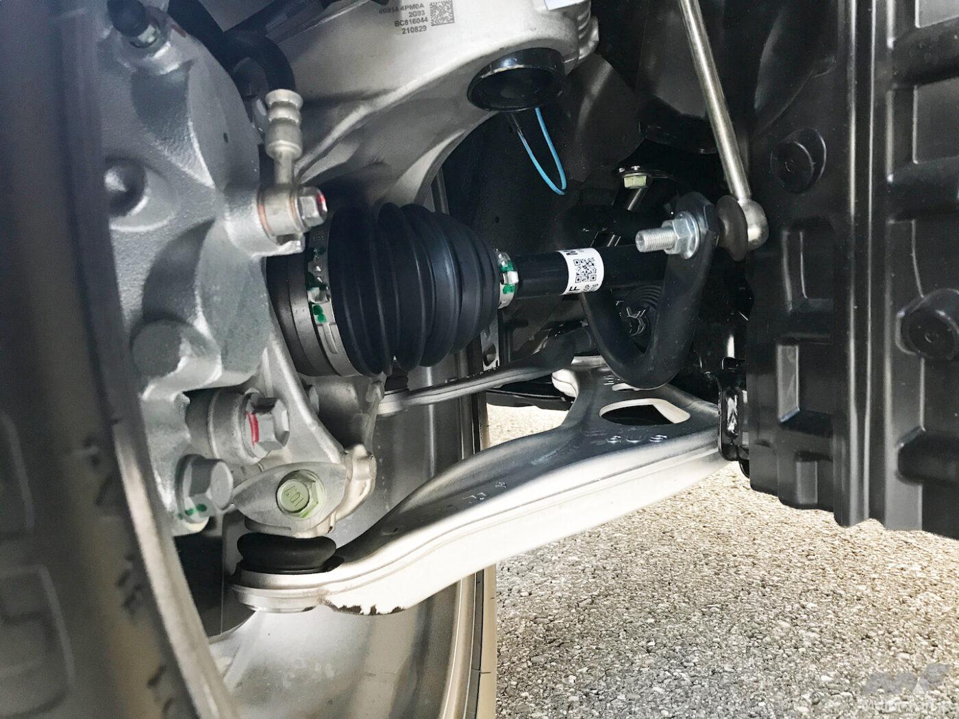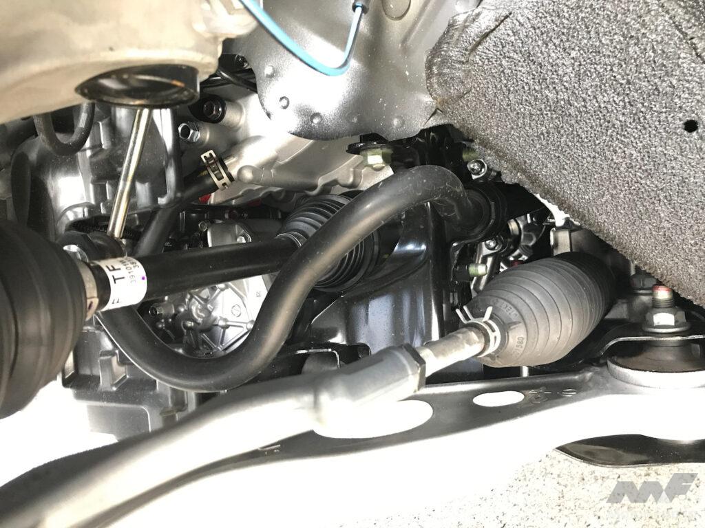 自動車ニュース テクノロジー プレスリリース 車の知識 アウトランダーPHEV 三菱・新型アウトランダーPHEV(GN0W型)のサスペンションを眺めてみる 2022.02.02 15:15 by Motor Fan illustrated編集部 この記事の画像をもっと見る(全13枚) 三菱自動車のアウトランダーがフルモデルチェンジを果たした。今回はPHEVモデルのみの展開(日本仕様:2022年2月現在)。乗る前にじっくりとサスペンションをじっくり眺めてみた。 連載サスを眺める INDEXリヤサスペンションフロントサスペンション リヤサスペンション リヤサスペンション全体を後左方から。ダブルウィッシュボーン型のマルチリンク式。手前に写る大きな筒はリヤサイレンサ。その奥にリヤモータユニットが見える。ご存じ、MMCのPHEVシステムはAWD駆動方式であり、前後モータを備えるプロペラシャフトレス。 右側のリヤサスペンションを後方から。ロワリンクのリヤ側は舟形形状でばねを収める。同じくロワリンクのフロント側はI(アイ)断面形状で、ショックアブソーバをマウントする。素材はともにスチール製の板金工法。後端にサブフレームのマウント部が見て取れる。サブフレームを横断する管はモータ水冷用のクーラントパイプ。排気管は車両の右方を通すレイアウト。 なぜ排気管が車両右方を迂回するかというと、車両中央にはバッテリパックが備わるため。写真は後方から眺めたところ。パックのうしろは燃料タンク。写真手前には冷却水のセンド/リターンのパイプが見て取れる。 右側のリヤサスナックル部。ドライブシャフトの上にはアルミ合金製のアッパーリンクが見える。キャリパにADVICSの記載を確認、本車の技術トピックのひとつである協調回生ブレーキのキーデバイスである。 同部位を上から見たところ。アッパーアームの形状と配置が見て取れる。ショックアブソーバは内傾かつ前傾配置。 右側リヤサスを前方から。ショックアブソーバを横切り、ナックルから短く伸びるのはトーコントロールリンク。アッパーアームは下開放の皿形状であることがこの角度からわかる。そのアッパーアーム前端に短いリンクを介し、アンチロールバーが接続されている。 リヤデファレンシャル部。形式はFR車と同様の機械式で、差動制限機構は備わらない。これのうしろ(写真では左上側)にYA1型駆動モータが備わる。 フロントサスペンション 右側フロントサスペンションを前下方から。形式はマクファーソンストラット式。ロワーアームはアルミ合金製。ブッシュ配置は(写真では見えないが)前側がホリゾンタル、後側がバーチカル。前側のブッシュは非常に小さくソリッドな印象。 同部位を少し上から見たところ。ストラットボディから長いリンクを介してアンチロールバーを接続する。 左側フロントサスを後下方から。ナックルはアルミ合金製で複雑な形状としている。タイロッドエンドもアルミ合金製で、最大舵角時の逃げを湾曲構造で作る。ボールジョイントはロワーアーム/タイロッドエンドともに上向きピン配置。 同部位を少し上から見る。ドライブシャフトとステアリングラックの位置関係はこのような感じ。ドラシャを上手によけてアンチロールバーが配置される(というか、あいているところを縫うように設置せざるを得ない)。 試乗車の装着タイヤはブリヂストンのECOPIA H/L422 Plus。サイズは255/45R20、指定圧は前後ともに250kPa。 連載 サスを眺める プレスリリース 2023.01.29 トヨタ・ランドクルーザー[300系]のサスペンションを眺めてみる テクノロジー 2023.01.28 日産・新型セレナ[C28型]のサスペンションを眺めてみる テクノロジー 2023.01.27 レンジローバーのサスペンションを眺めてみる テクノロジー 2023.01.26 日産アリアのサスペンションを眺めてみる テクノロジー 2023.01.25 日産フェアレディZのサスペンションを眺めてみる テクノロジー 2022.07.20 トヨタ・新型クラウン(クロスオーバー)のサスペンションを眺めてみる 連載の記事一覧へ テクノロジーの関連記事 三菱 アウトランダーPHEVの厳選中古車物件情報 中古車トップ 【注意】 自動車カタログ・厳選中古車情報に掲載されている写真は、年式やグレードの違う車種が含まれます。掲載されている写真はそれぞれの車種用でないものも含まれています。また、対応は年式やグレード、 装備などにより異なる場合があります。購入の際は必ずご確認ください。 商品の価格・仕様・発売元等は記事掲載時点でのものです。商品の価格は本体価格と消費税込みの総額表記が混在しております。商品を購入される際などには、メーカー、ショップで必ず価格・仕様・返品方法についてご確認の上、お買い求め下さい。 購入時のトラブルについて、出版元・編集部は一切関知しません。また責任も負いかねます。