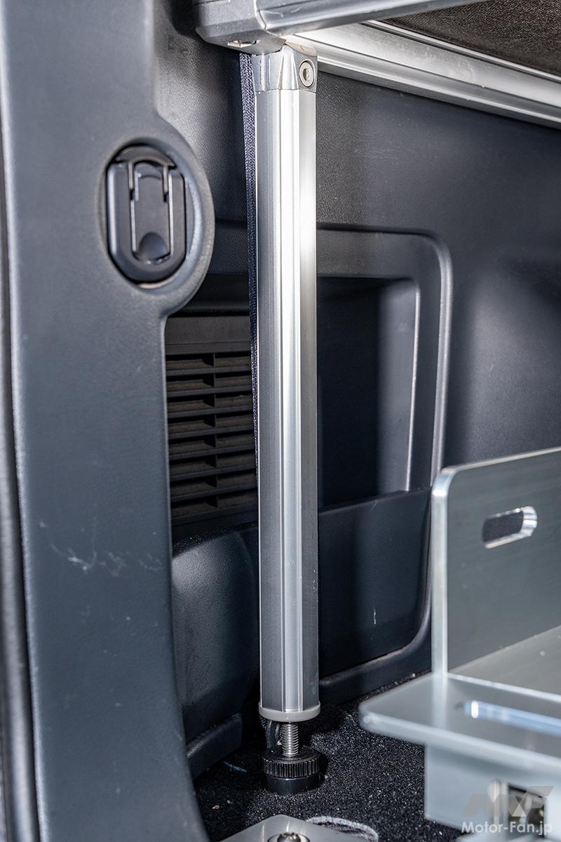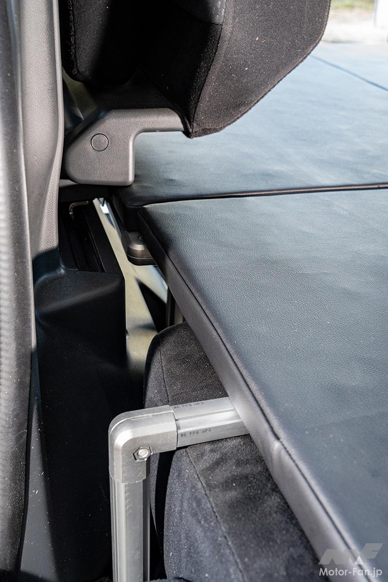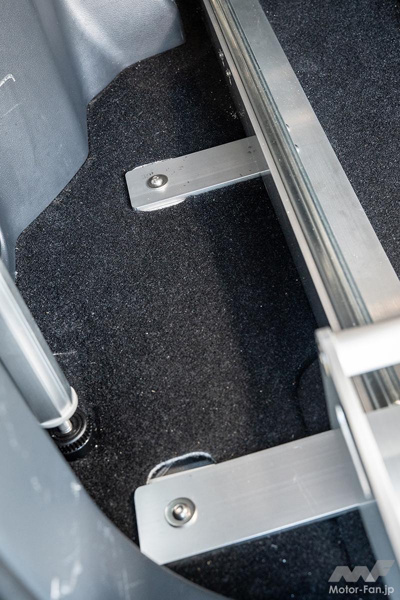 車中泊 これ絶対導入したい!! 耐荷重100kgなのに引き出し楽々! 『デリカD:5』専用のアルミスライドフロア【写真・10枚目】 足元を引き締めているデルタフォースOVALはマッドガンブラック×マッドブラックの「ごぶやまパート2」限定カラーモデル。 スライドフロアのスライドレールは耐荷重100kgを誇るが無理せず余裕を持った運用を心がけたい 独自機構でセンターバーでのロック解除とフロアの押し引きを実現。 スライドフロア前後の先端や両サイドにはオーバル形状の穴が開いているが、これは荷物を固定するためのベルト等を通すためのもの。とくに強いテンションをかけることができるタイダウンベルトは、走行時の揺れなどから荷崩れを防ぐのに最適だ。ここで紹介しているローラーカムのベルトであれば、軽い力でテンションをかけられるだけでなくデザイン性にも優れていてカッコ良い。何本か車載しておくとイザという時に役立つだろう。 積載物をベルトほどガッチリ固定する必要はない、ルーズでも良いので手軽にホールドしたい方は伸縮ネットを活用するのが吉。その場合はピンポイントで設置されたM10サイズのボルト穴を活用し、オプションで用意されているアイボルトを組み込むことでフック類も簡単に固定可能だ。荷物を降ろせばそのままテーブルとして利用できるのもスライドフロアの強み。ちなみに荷物の固定にベルトorネット、どちらを使うかは完全に利用者の好みです!! HMスタイルが満を持して販売開始するスライドフロア向けに新開発されたのが、必要最小限の支柱で機能する「車中泊ベッド・フルサイズFSII」だ。2列目シート以降をフルフラット化できるだけでなく左右シートの個別利用も可能で、今後も併売されるセンターテーブル機能付き「フルサイズFS」に対して2万円ほどのプライスダウンも実現。 ご覧の通りベッドフレームの支柱をフロア両サイドに集約することで、スライドフロアの設置スペースを確保しながら完全フラットな車中泊スペースを構築。また、3列目シートを取り外すことなく跳ね上げた状態で使用できるのも大きなアドバンテージで7人乗車も多用するユーザーの要望にもしっかりと応えている。 この画像の記事を読む